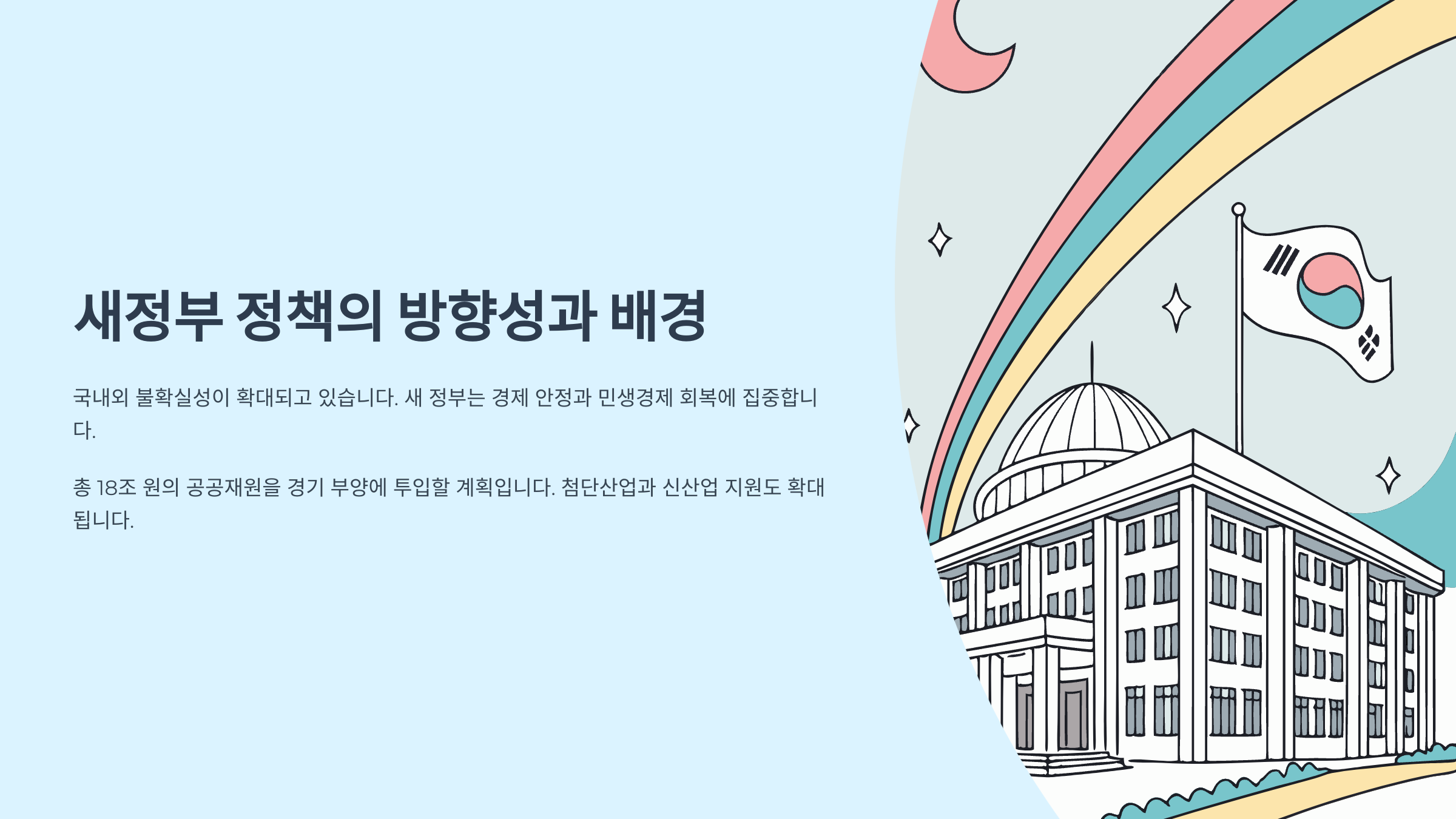 2025년 출범한 새정부는 "혁신과 회복"을 기조로 삼고 있어요. 전 세계적인 경기 침체와 기후 변화, AI 기술 확산 등 여러 글로벌 이슈에 대응하면서 국내 문제인 양극화, 청년 실업, 저출산 등에 집중하는 모습을 보여주고 있죠.