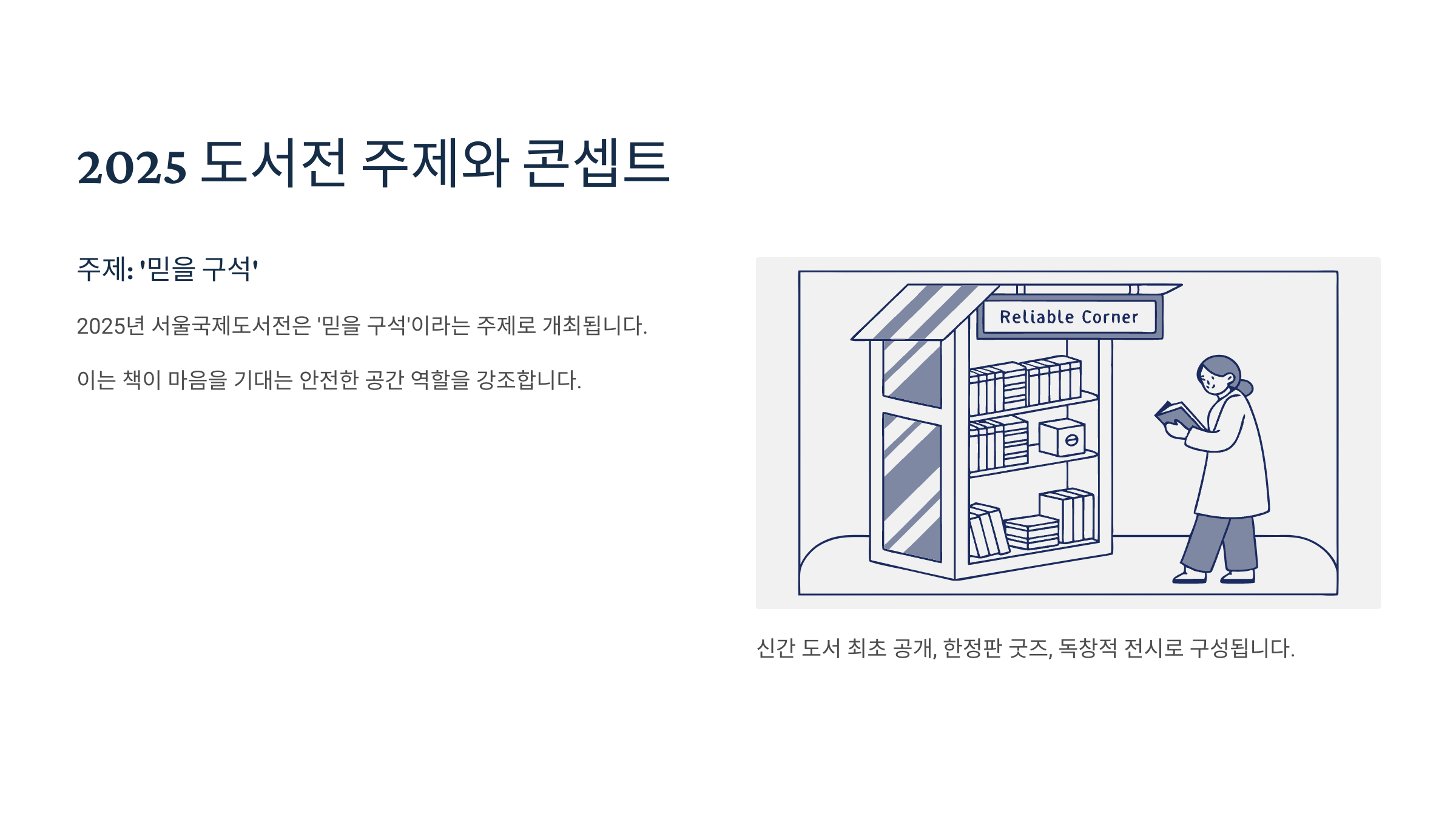 결론적으로, 2025년 도서전의 콘셉트는 ‘책이라는 콘텐츠가 어떻게 더 넓게 확장될 수 있는가?’에 대한 대답이에요. 주제에서 말하듯, 책은 경계를 넘어서는 힘을 가지고 있어요. 📗 이제 도서전의 일정과 장소도 알아볼까요?