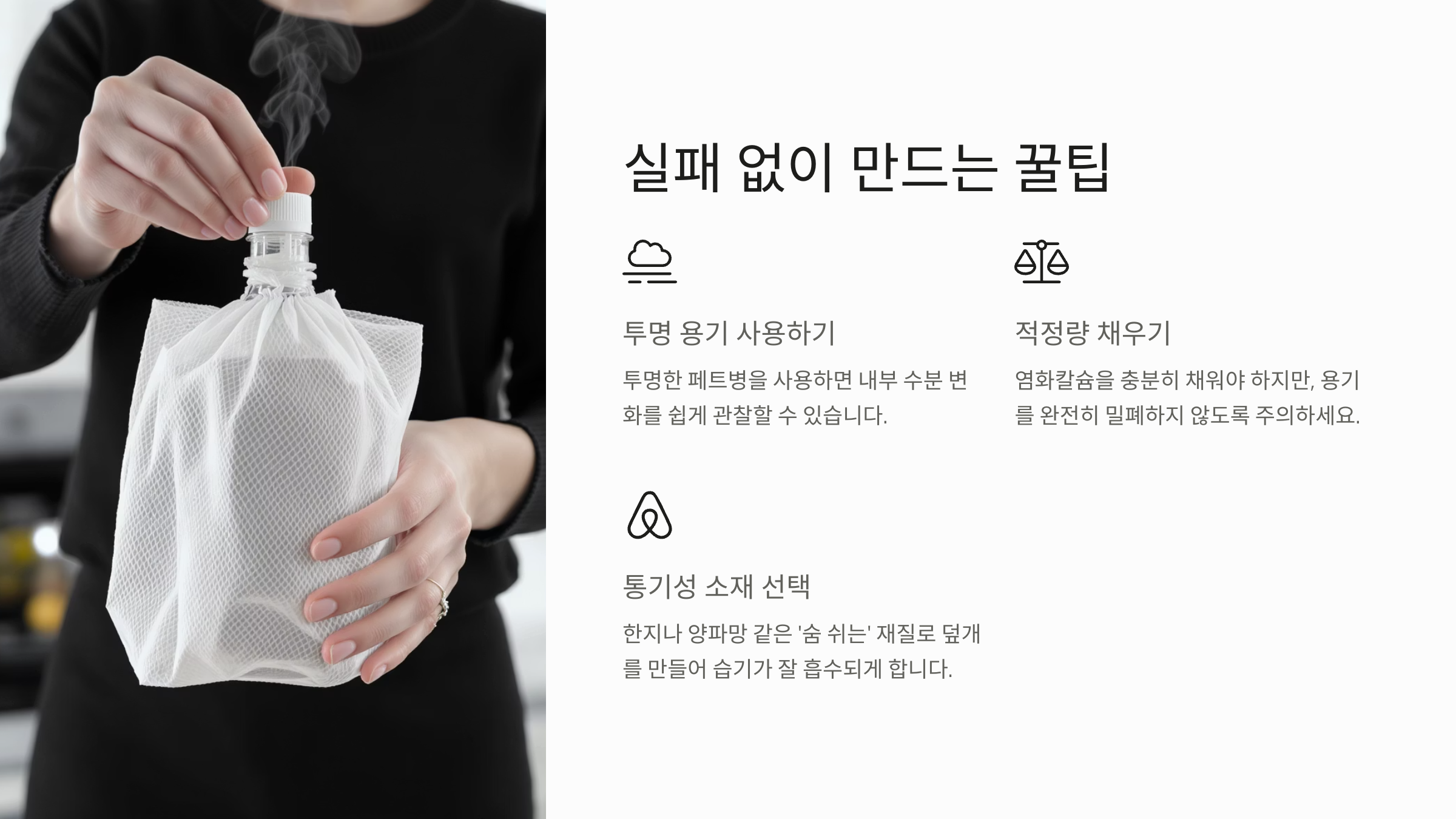 첫째, 염화칼슘은 수분에 매우 민감하므로 개봉 즉시 사용하고, 보관할 땐 반드시 밀봉해서 습기를 차단해야 해요. 두 번째는 부직포나 커피 필터가 헐거우면 내용물이 아래로 쏟아질 수 있으니 꼭 단단히 고정해 주세요.