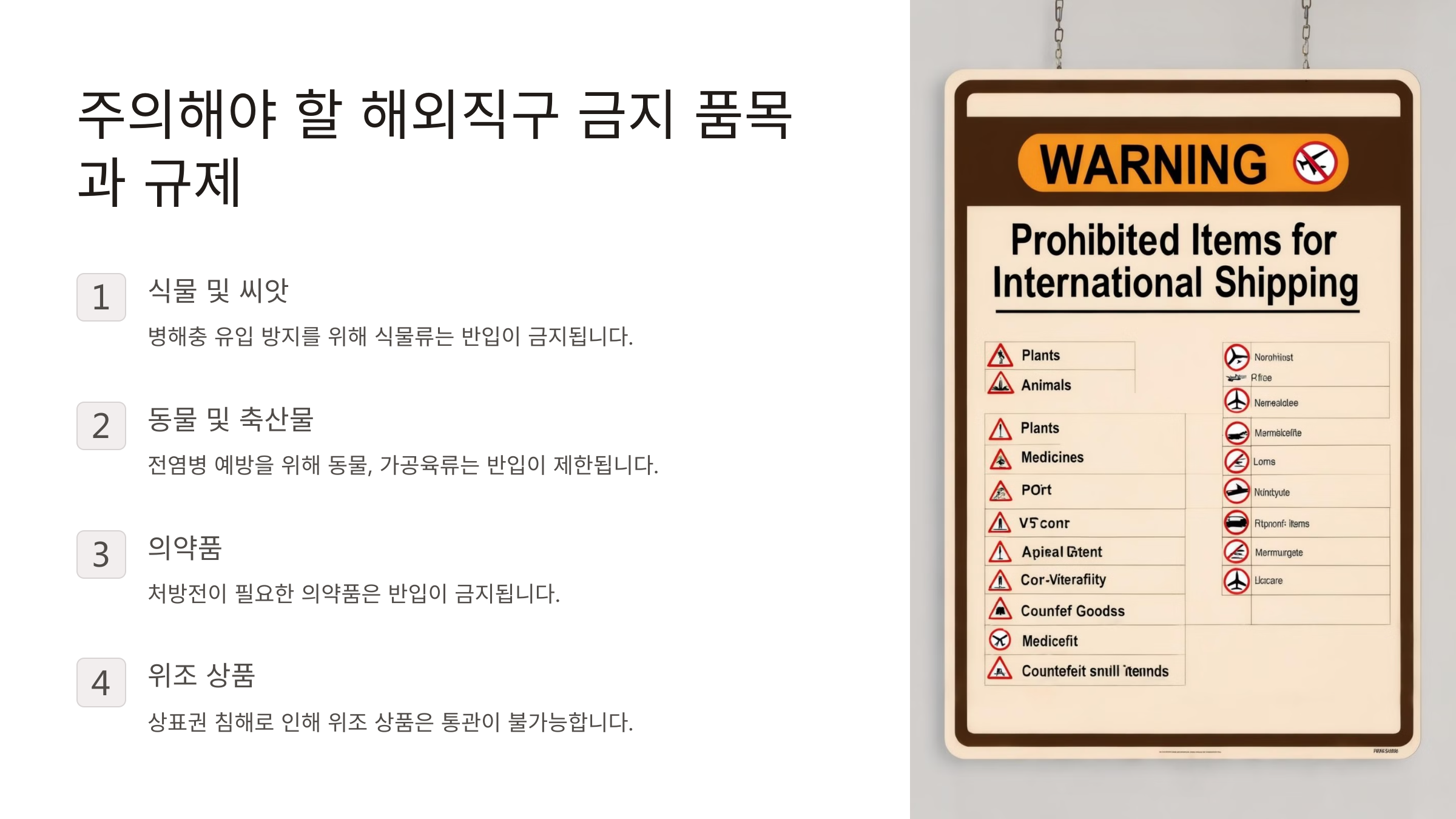 해외직구를 할 때는 모든 물건을 자유롭게 구매할 수 있는 건 아니에요. 한국으로 들여오는 것이 금지되거나, 특별한 허가가 필요한 품목들이 있기 때문이죠! 🚨