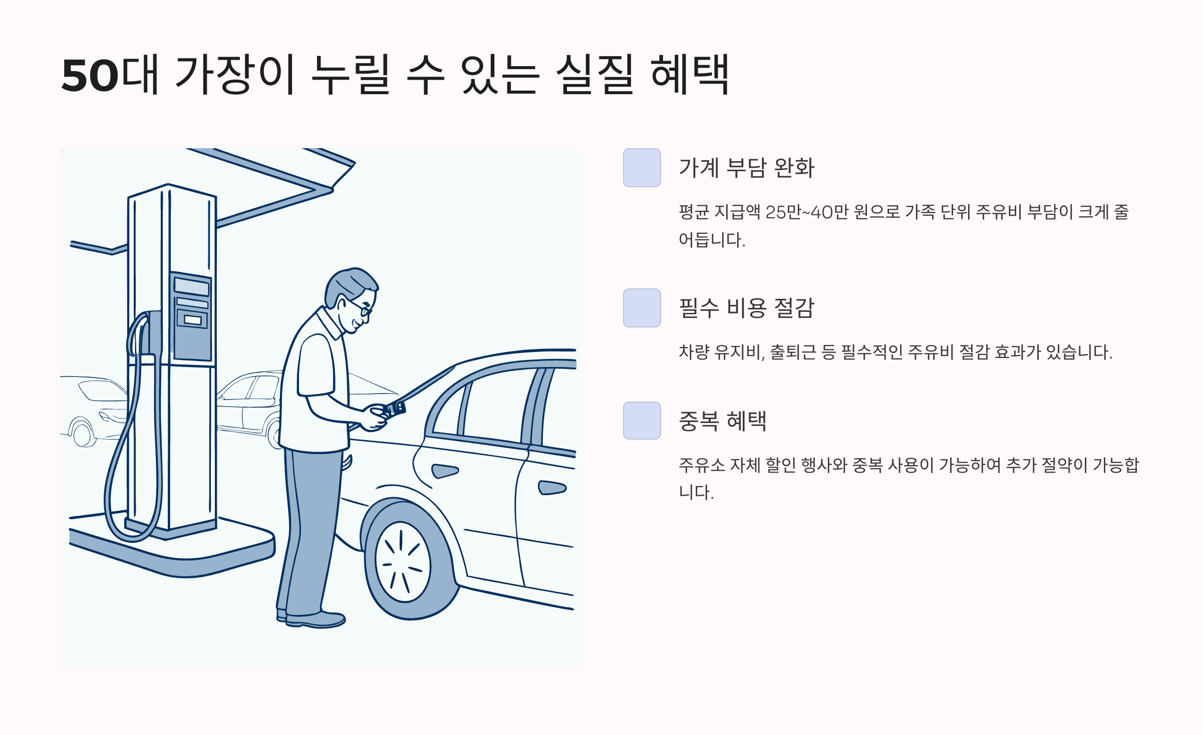 특히 50대 가장이라면 차량 사용이 많은 라이프스타일일 텐데요. 출퇴근, 주말 나들이, 장보는 일까지 모두 차량으로 이동하는 경우가 많잖아요. 이런 분들에게 주유비 절감은 곧 생활비 절약이에요!