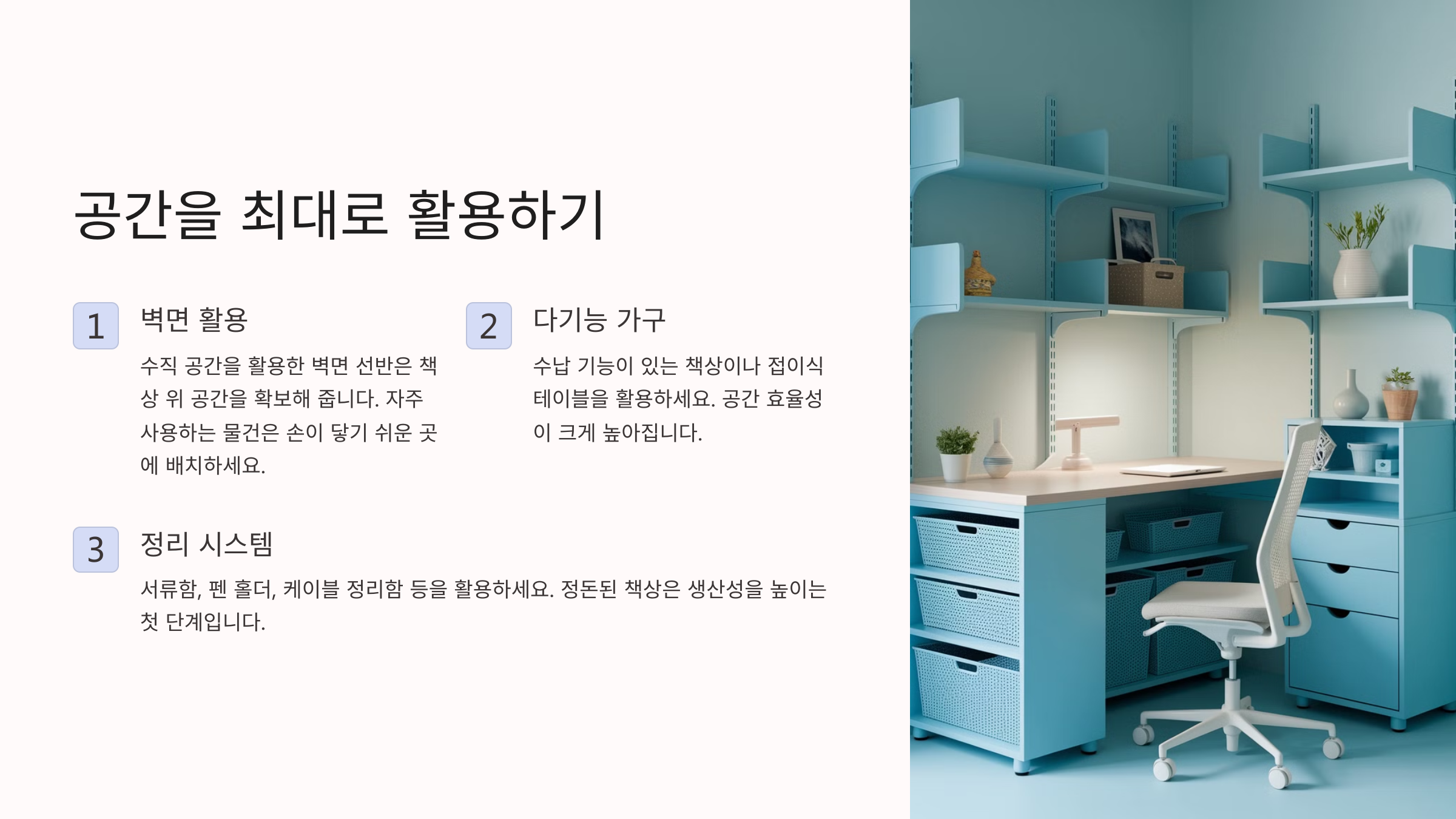 책상 위 공간을 최대한 활용하기 위해서는 벽 선반이나 매달 수 있는 수납장을 사용하는 것도 좋아요. 책상 위를 항상 깔끔하게 유지하면, 책을 찾거나 공부할 때 시간을 절약할 수 있어요.