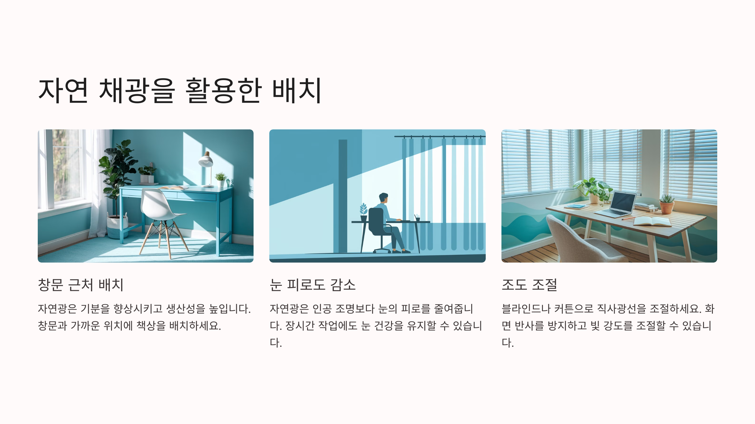 추가로, 자연광만으로는 충분하지 않을 경우, 색온도가 낮은 따뜻한 톤의 조명을 보조로 설치하면 눈의 피로를 줄일 수 있어요. 자연광과 인공조명을 효과적으로 활용해 최상의 학습 환경을 만들어보세요.