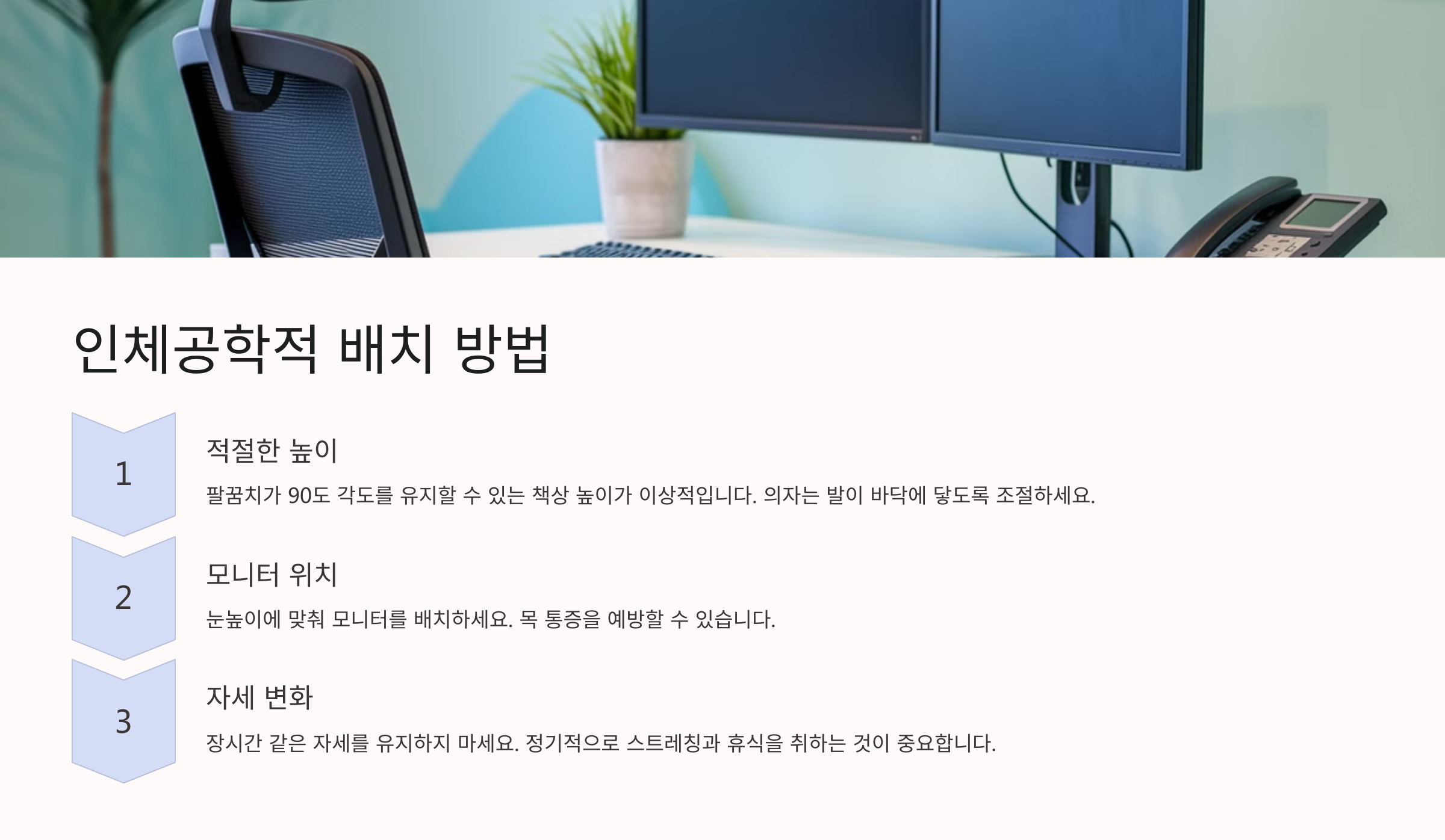 손목과 팔의 부담을 줄이기 위해 키보드와 마우스를 적절한 위치에 배치하는 것도 중요해요. 팔꿈치와 손목이 일직선이 되도록 유지하고, 손목 받침대를 사용하면 편안함을 더할 수 있어요.