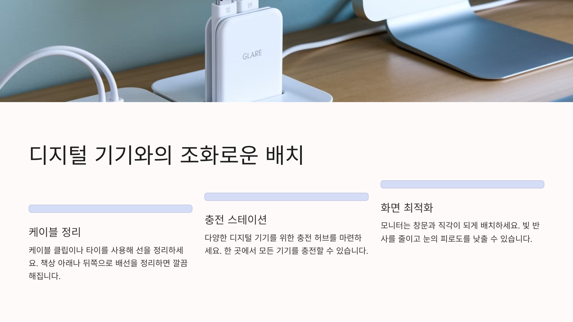 먼저, 전기 콘센트와 기기 간의 거리를 고려해 배치를 계획하세요. 선이 꼬이거나 엉키지 않도록 케이블 정리함을 사용하는 것이 좋아요. 깔끔한 정리는 시각적 안정감뿐 아니라 화재 위험도 줄여준답니다.