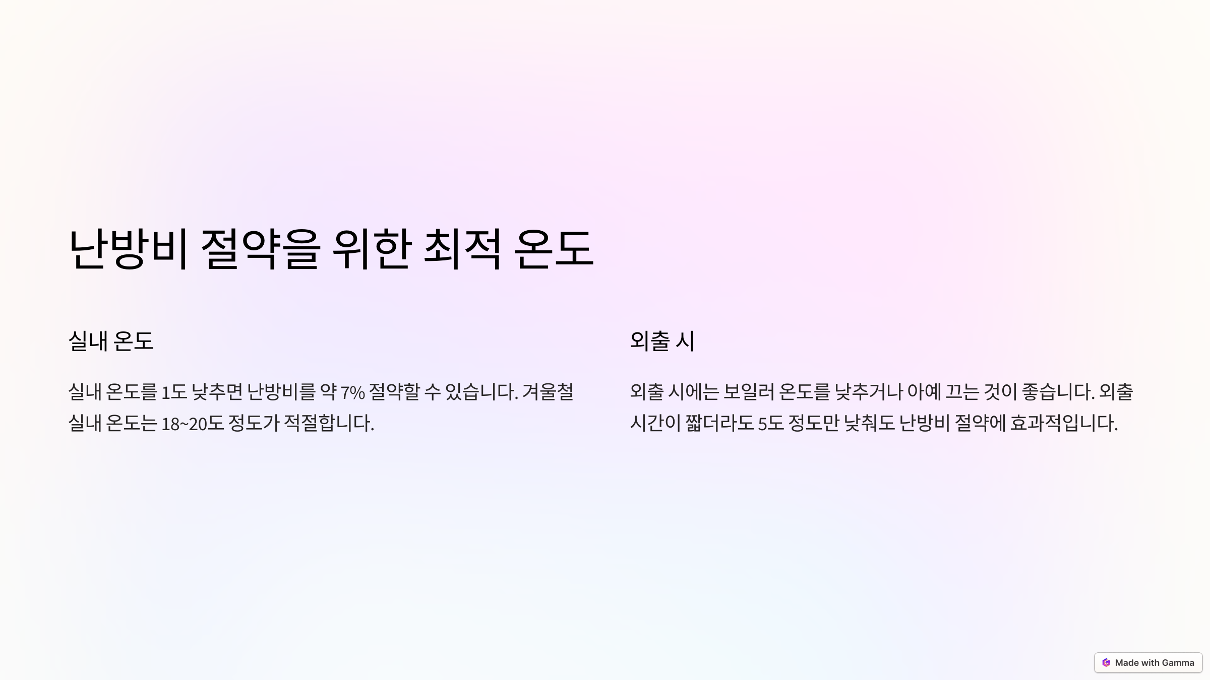 보일러를 18~22℃ 사이로 유지하면 난방비를 아끼면서도 충분히 따뜻한 실내를 만들 수 있어요. 또한, 외출할 때는 보일러를 완전히 끄기보다 15~18℃로 설정해 두는 것이 좋답니다.