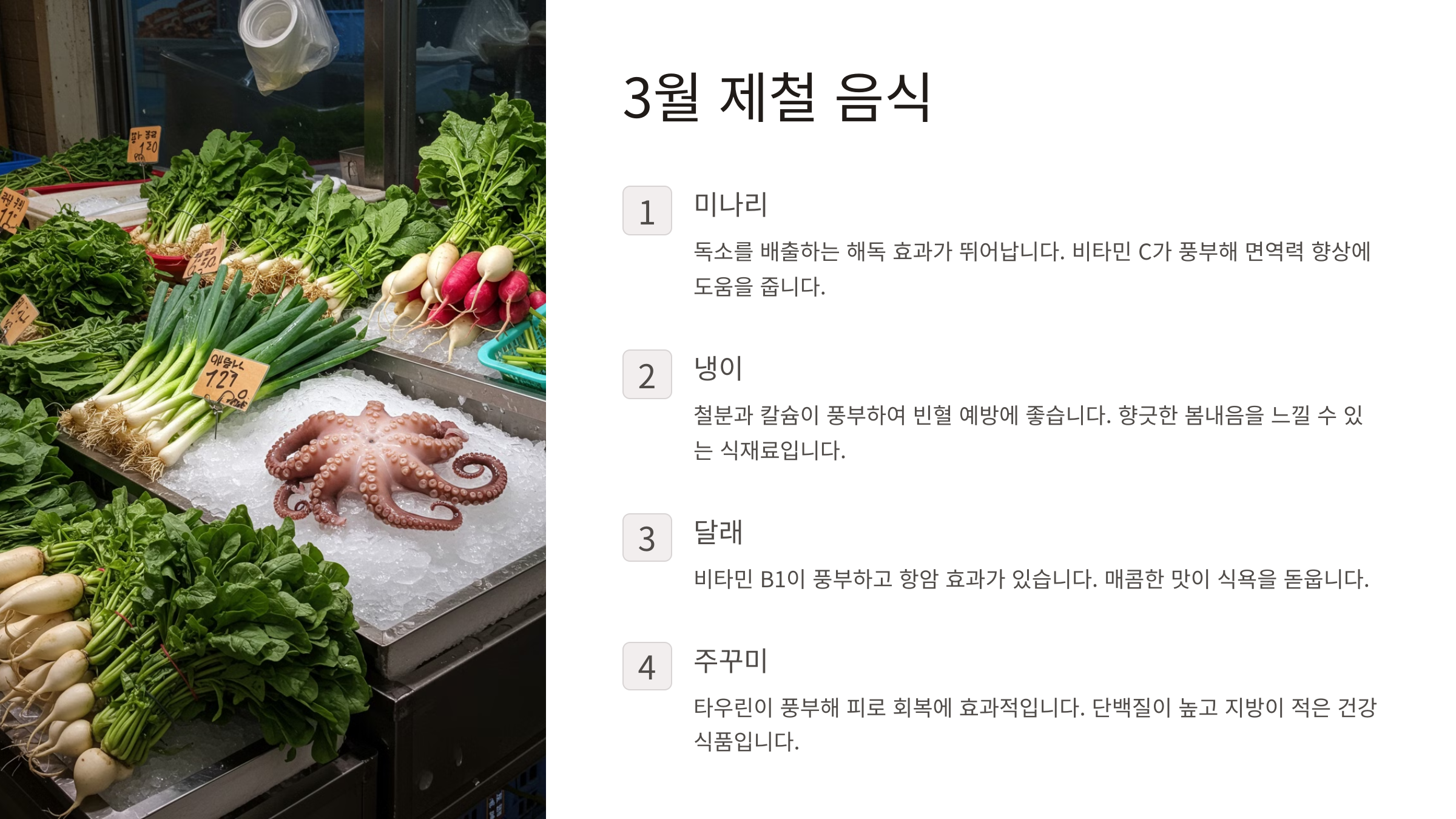 3월에는 겨울 동안 움츠렸던 몸을 깨워줄 다양한 봄나물과 해산물이 등장해요. 신선한 제철 재료를 활용하면 건강도 챙기고 맛도 좋답니다. 🍀