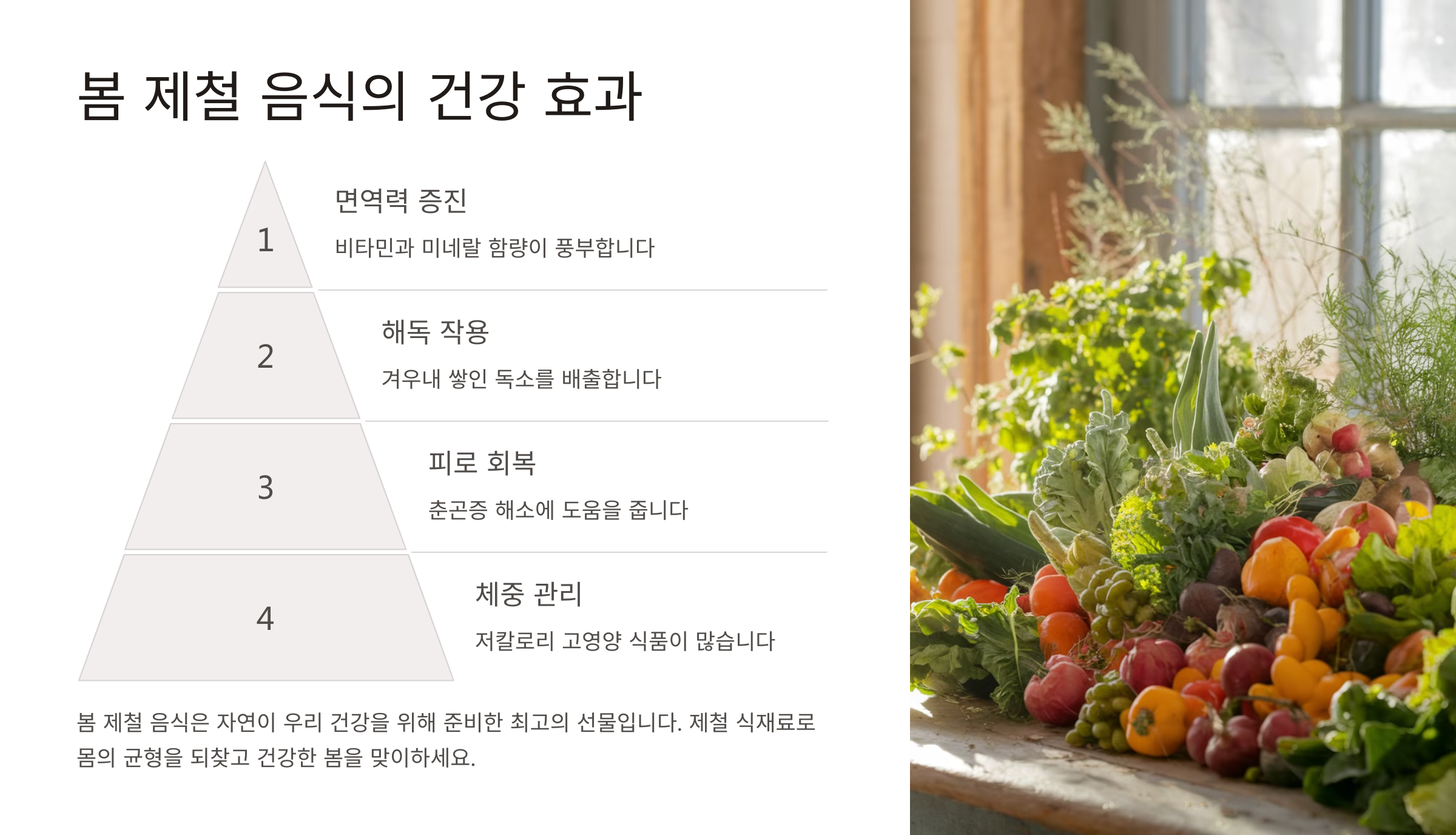 봄 제철 음식은 겨우내 지친 몸에 활력을 불어넣어 줘요. 비타민과 미네랄이 풍부해 면역력을 높이고, 신진대사를 활성화하는 데 도움이 된답니다. 🌱