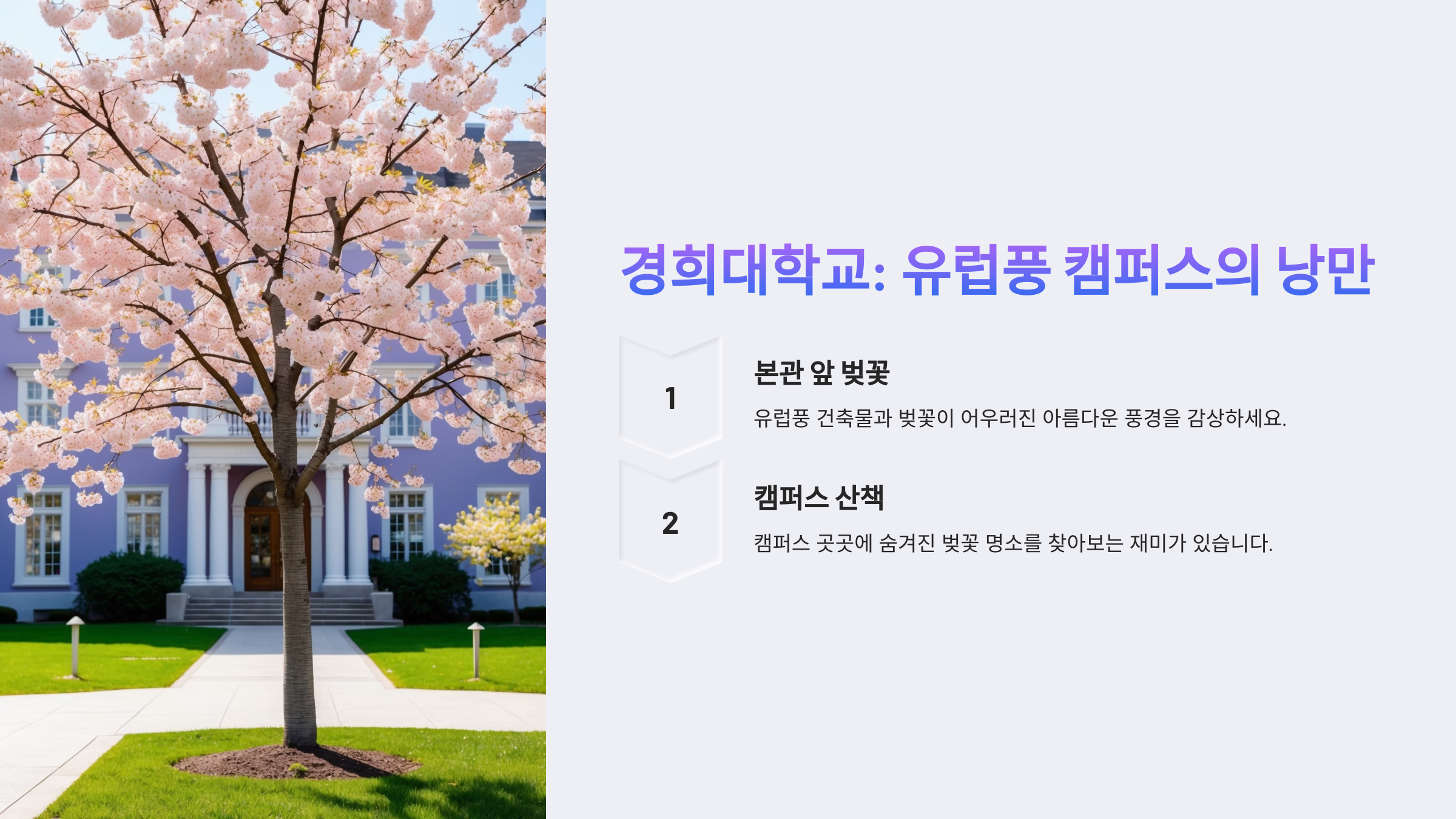 경희대학교는 고풍스러운 유럽풍 건물과 벚꽃이 어우러지는 특별한 명소예요. 캠퍼스를 걸으면 마치 유럽의 정원 속을 걷는 듯한 기분을 느낄 수 있답니다. 벚꽃이 만개한 캠퍼스는 로맨틱한 분위기를 연출해요.