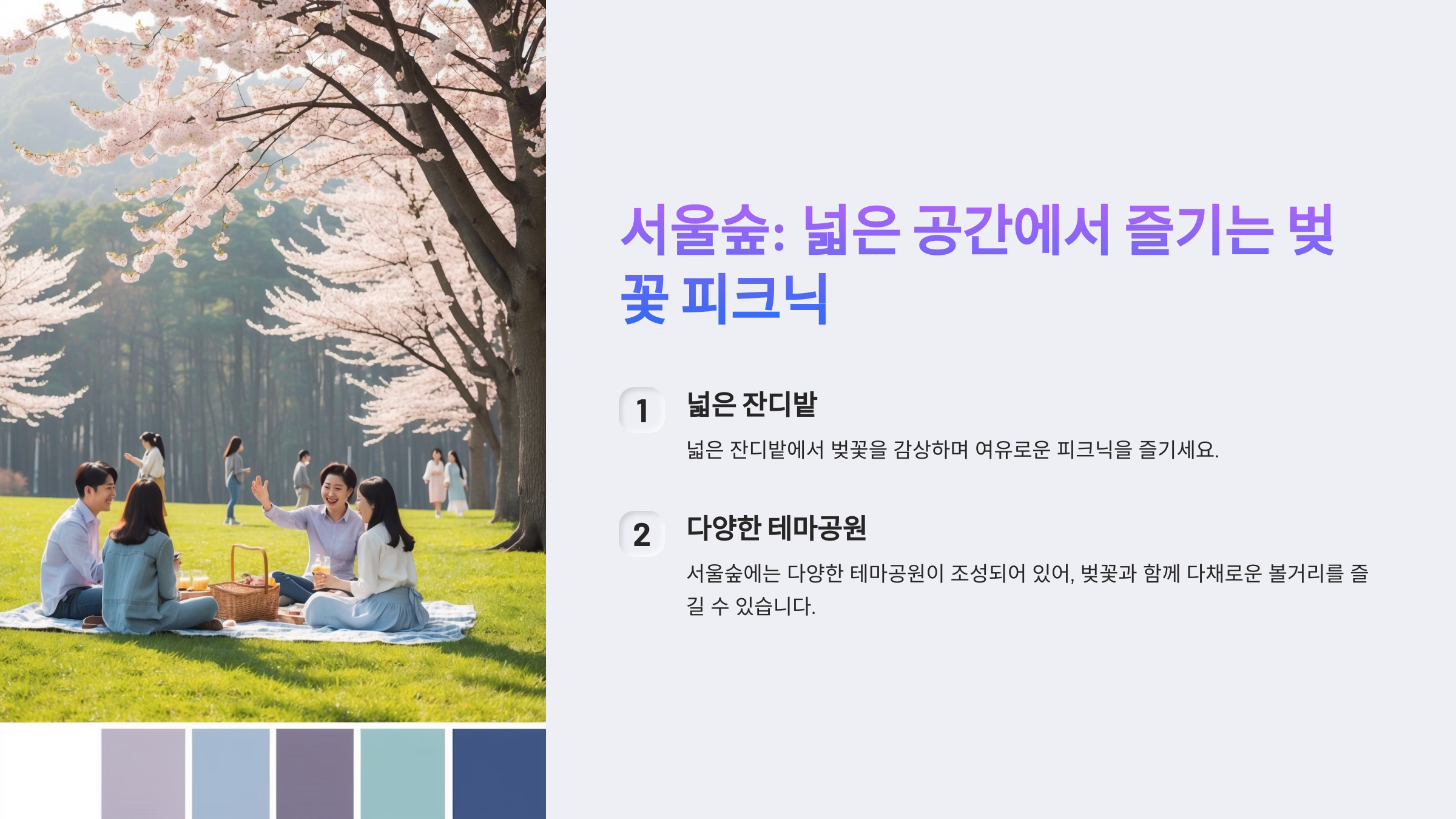서울숲은 넓은 잔디밭, 호수, 산책로가 잘 조성되어 있어서 벚꽃 아래에서 피크닉을 즐기기에도 좋은 장소예요. 또한, 사슴공원도 있어 가족 단위 방문객들에게도 인기가 많아요! 🦌🌸