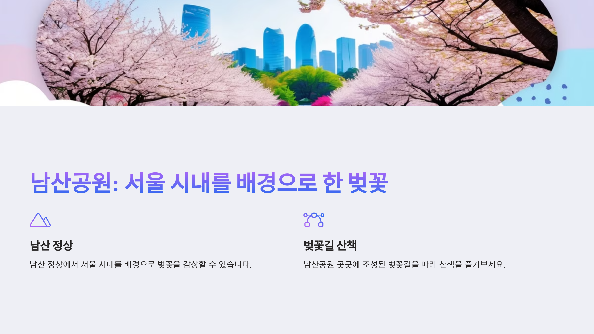 남산공원은 서울의 랜드마크인 N서울타워와 함께 벚꽃을 즐길 수 있는 명소예요. 남산 순환도로를 따라 피어 있는 벚꽃은 마치 영화 속 한 장면 같은 분위기를 연출하죠.