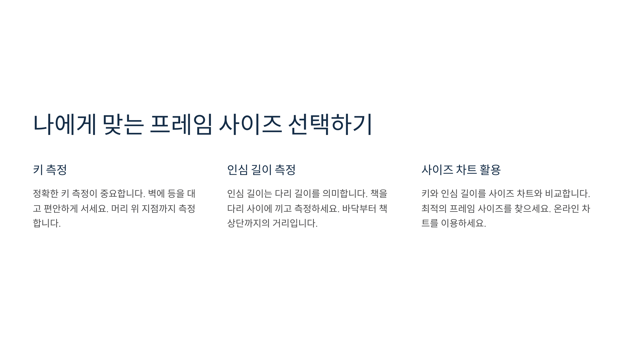 1. 키와 인심(Inseam) 길이에 맞는 사이즈 – 프레임 크기는 키뿐만 아니라 다리 길이(인심)도 고려해야 해요. 스탠드오버 높이(탑튜브 위에 섰을 때 다리 사이 여유 공간)를 확인해 보세요.