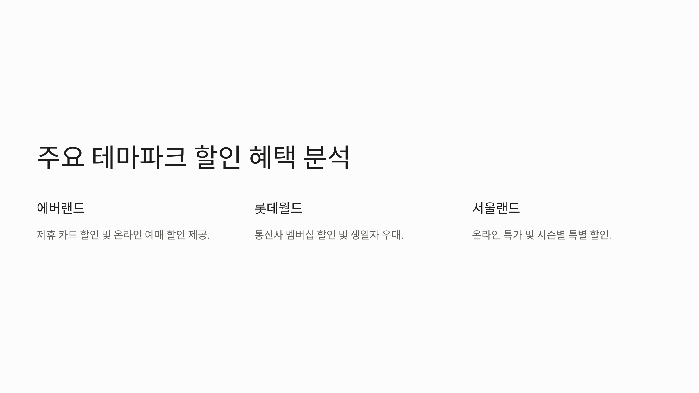 | 테마파크 | 기본 요금 | 할인 혜택 | 최대 할인율 |