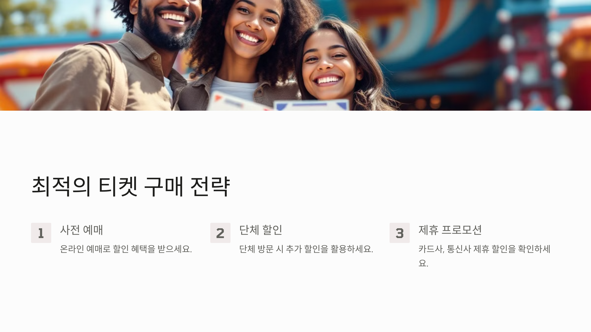 - 🎡 온라인 예매 할인: 카드사 홈페이지나 제휴 사이트에서 사전 예매하면 추가 할인이 적용돼요.