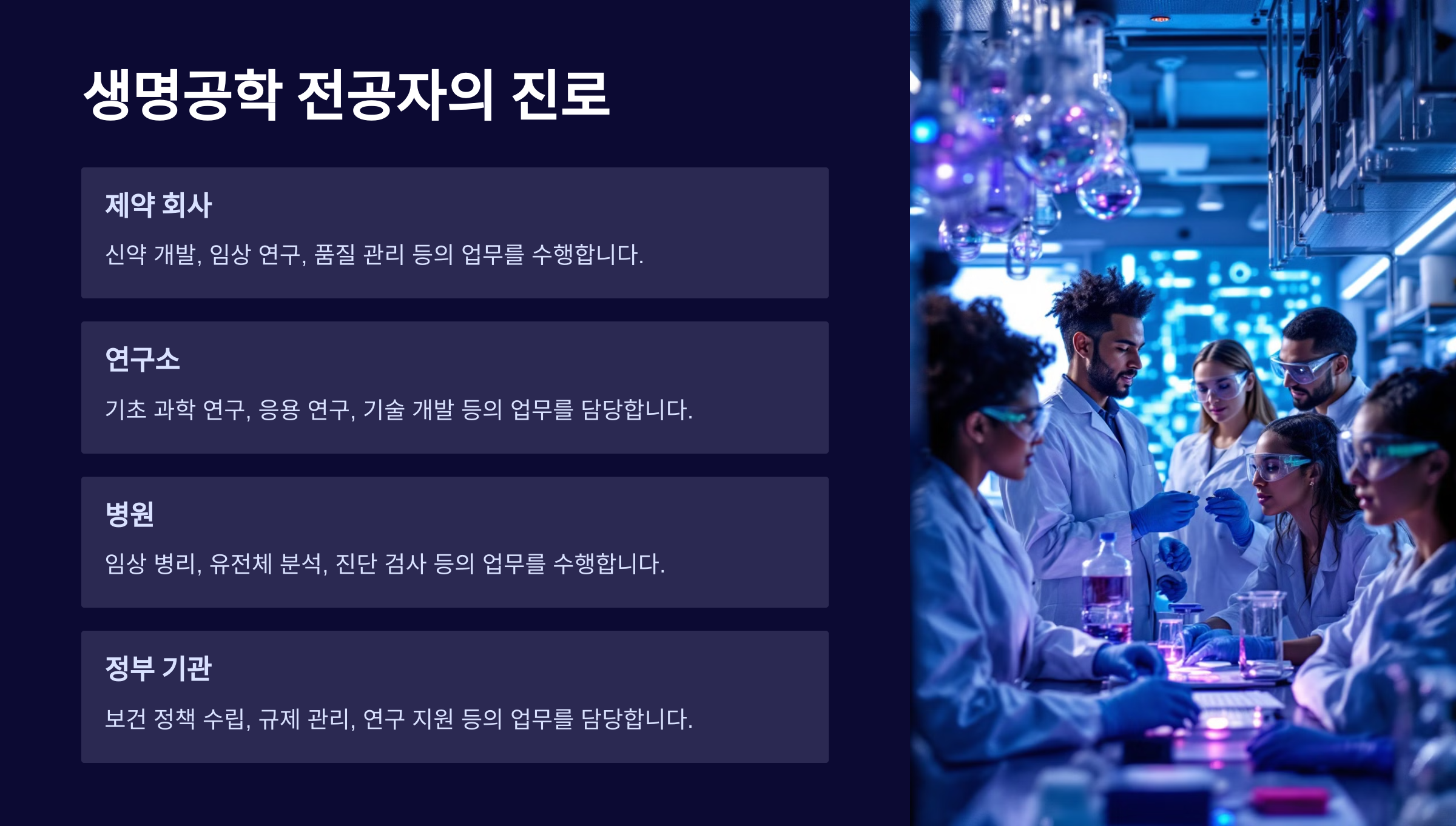 바이오·생명공학을 전공하면 다양한 분야에서 일할 수 있어요. 제약, 의료, 환경, 농업, 화장품 등 바이오 기술이 적용되는 산업이 점점 확대되고 있거든요. 🏥🌍