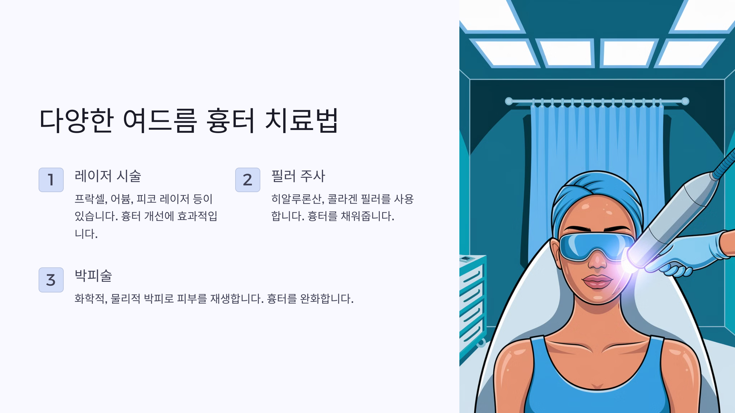 - 프락셀 레이저: 피부 깊숙이 침투하여 콜라겐을 활성화, 패인 흉터에 효과적