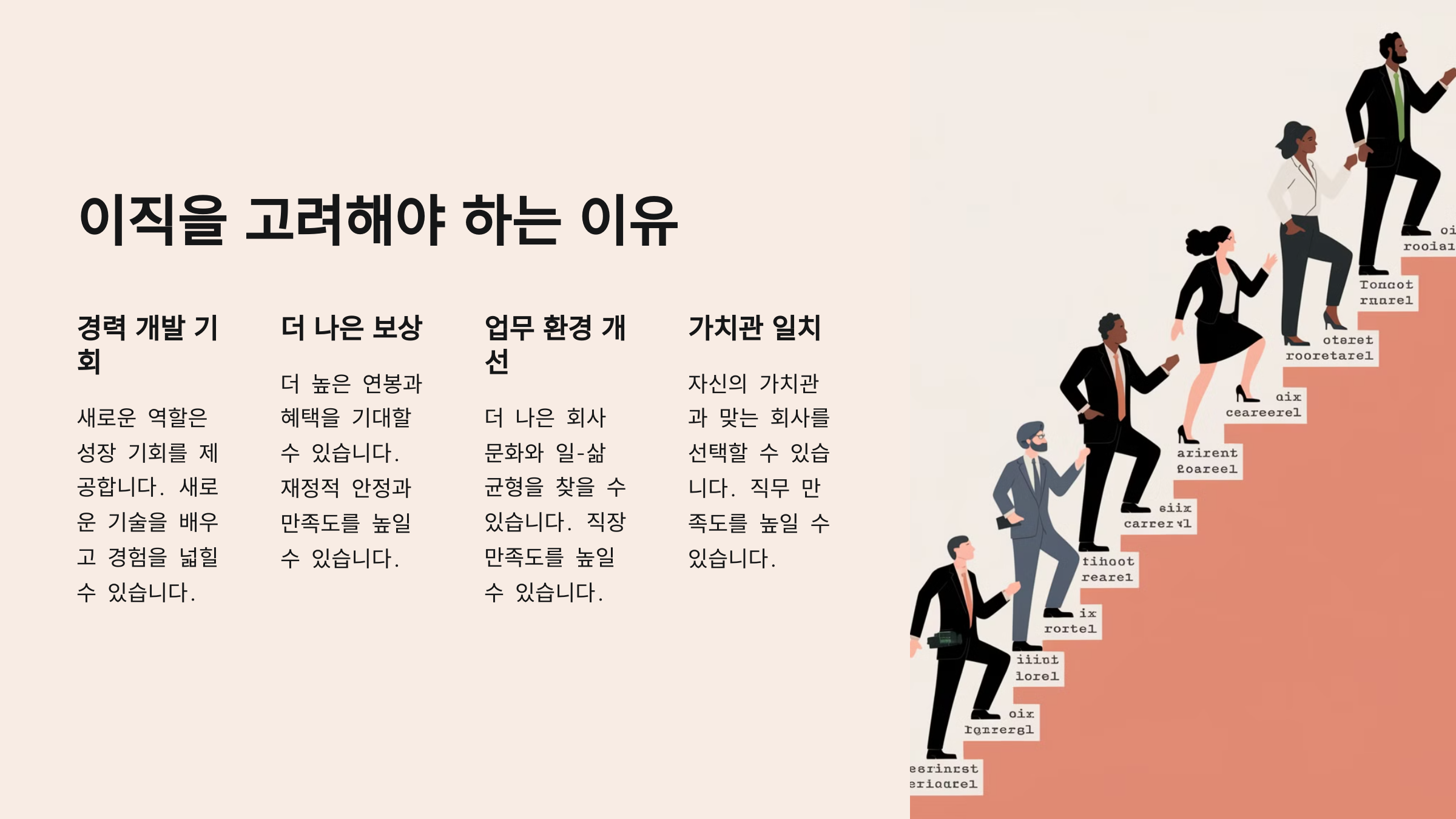 이직은 단순히 회사를 옮기는 것이 아니라, **더 나은 커리어와 성장 기회를 찾는 과정**이에요. 다음과 같은 이유가 있다면 이직을 고려해볼 만해요.