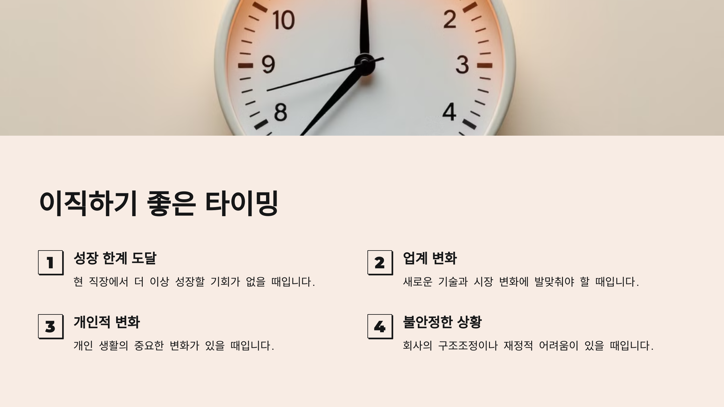 이직도 **타이밍이 중요해요.** 너무 성급하게 이직하면 후회할 수 있고, 너무 오래 머물면 기회를 놓칠 수도 있어요. 📅