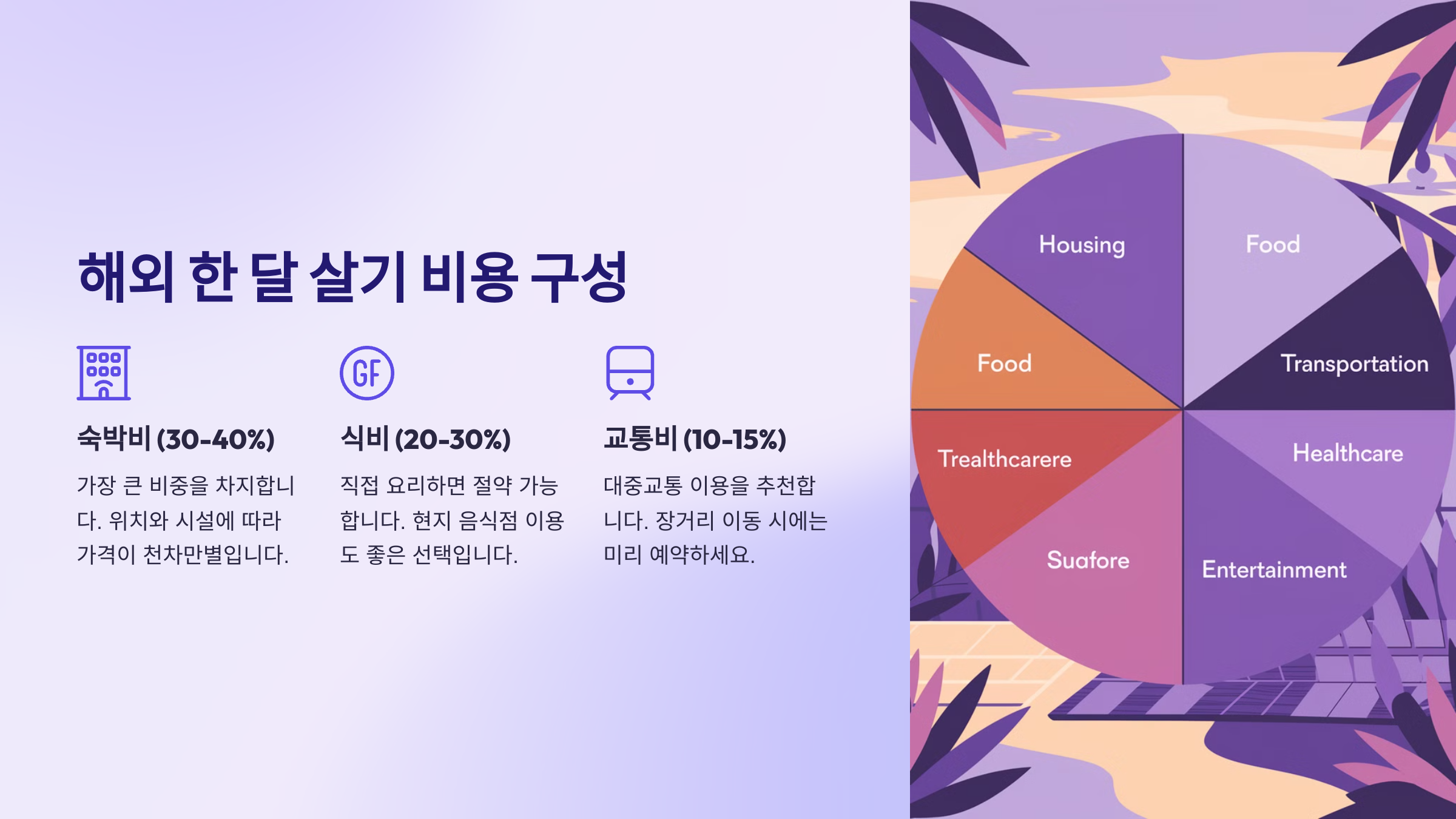 - ✔ **숙박비**: 호텔보다는 에어비앤비, 게스트하우스, 장기 렌탈이 저렴해요.