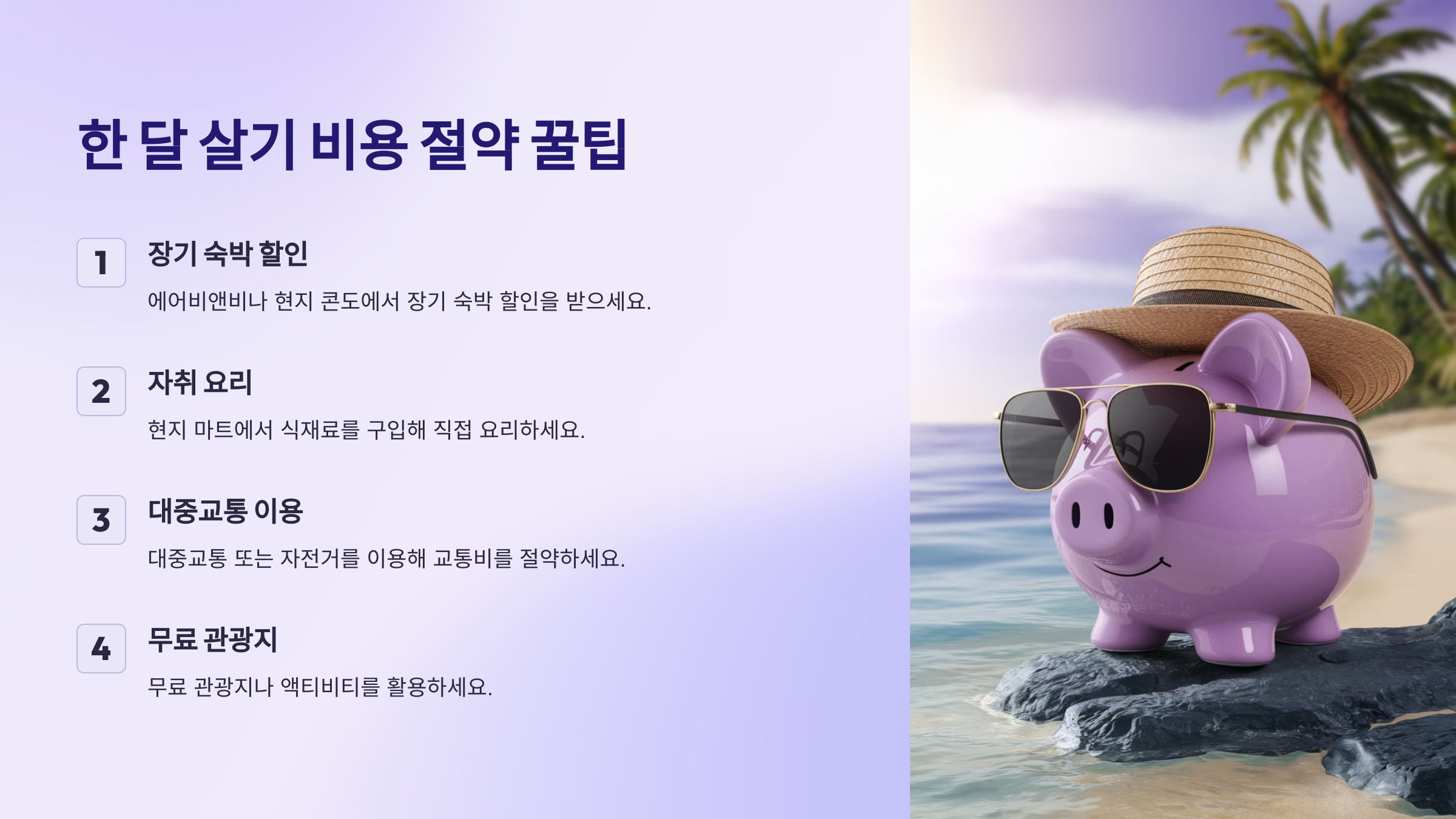 이제 **한 달 살기 비용을 절약하는 꿀팁**도 알아볼까요? ✨