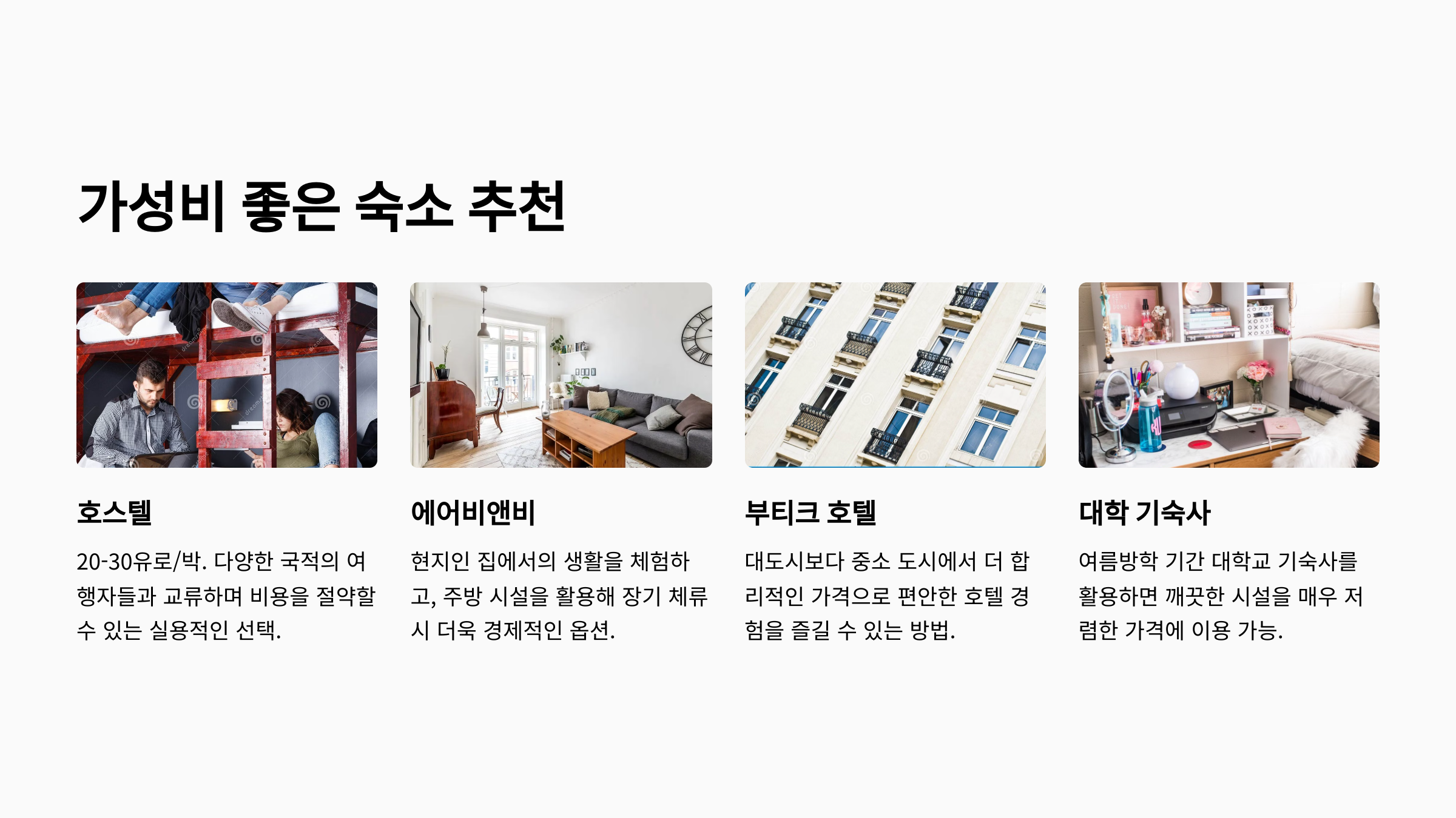 이제 **가성비 좋은 유럽 숙소 추천**도 살펴볼까요? 🏨