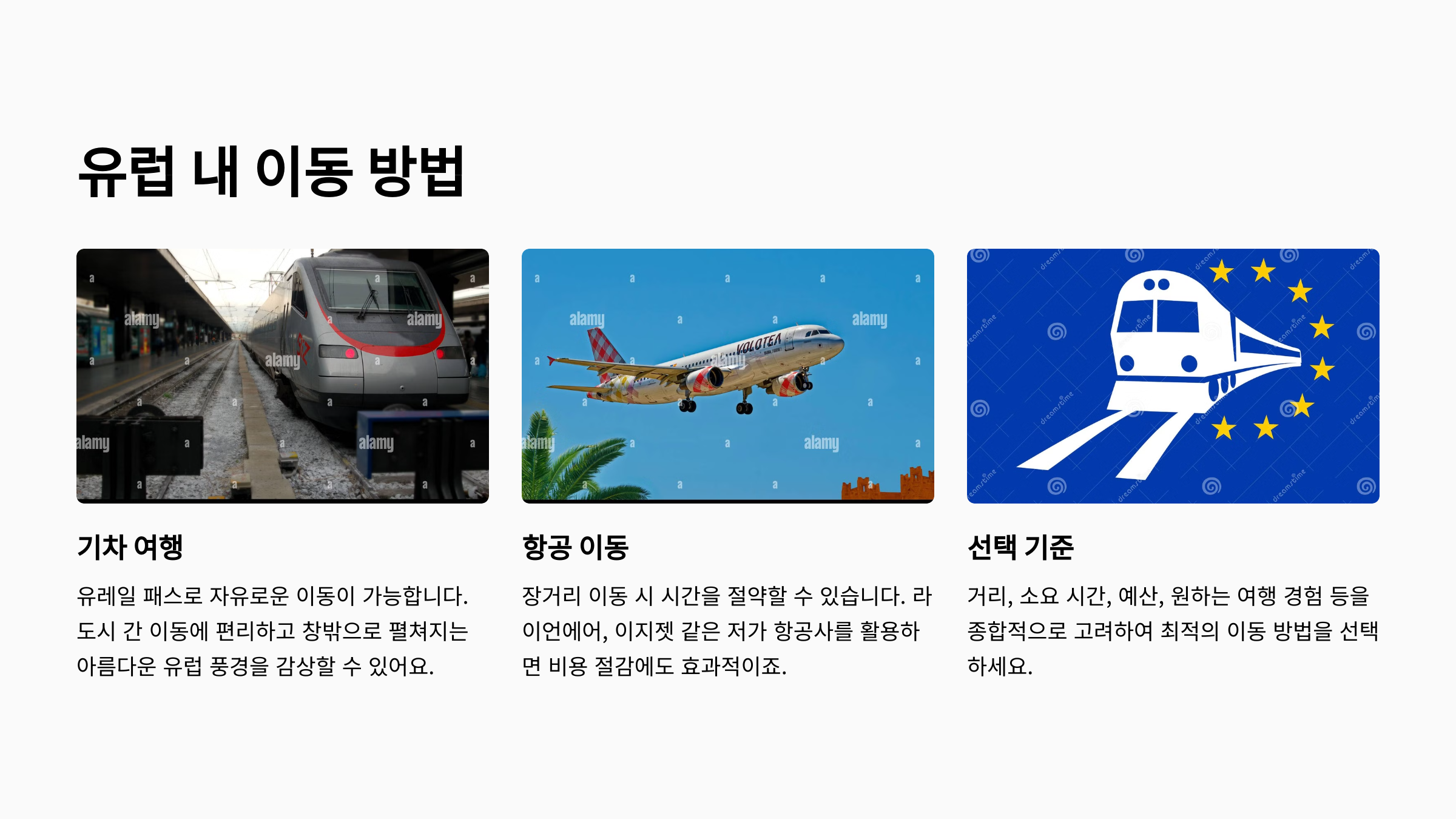 유럽 자유여행의 핵심은 **이동 수단을 어떻게 선택하느냐**에 달려 있어요! 🚄✈️