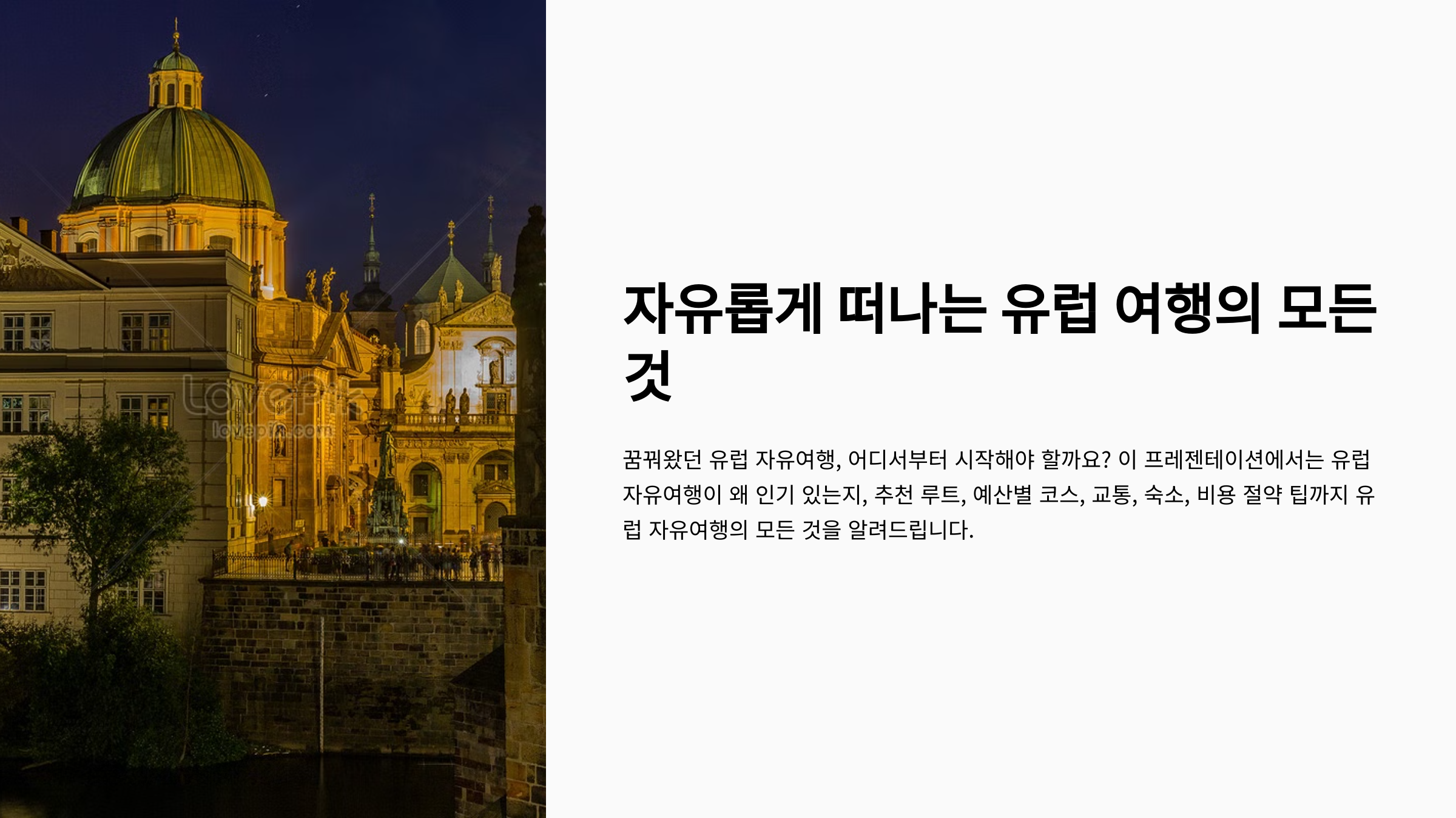 - ✔ **역사적인 명소가 가득**: 로마, 파리, 런던, 프라하 등 유럽 곳곳에 웅장한 문화유산이 많아요.