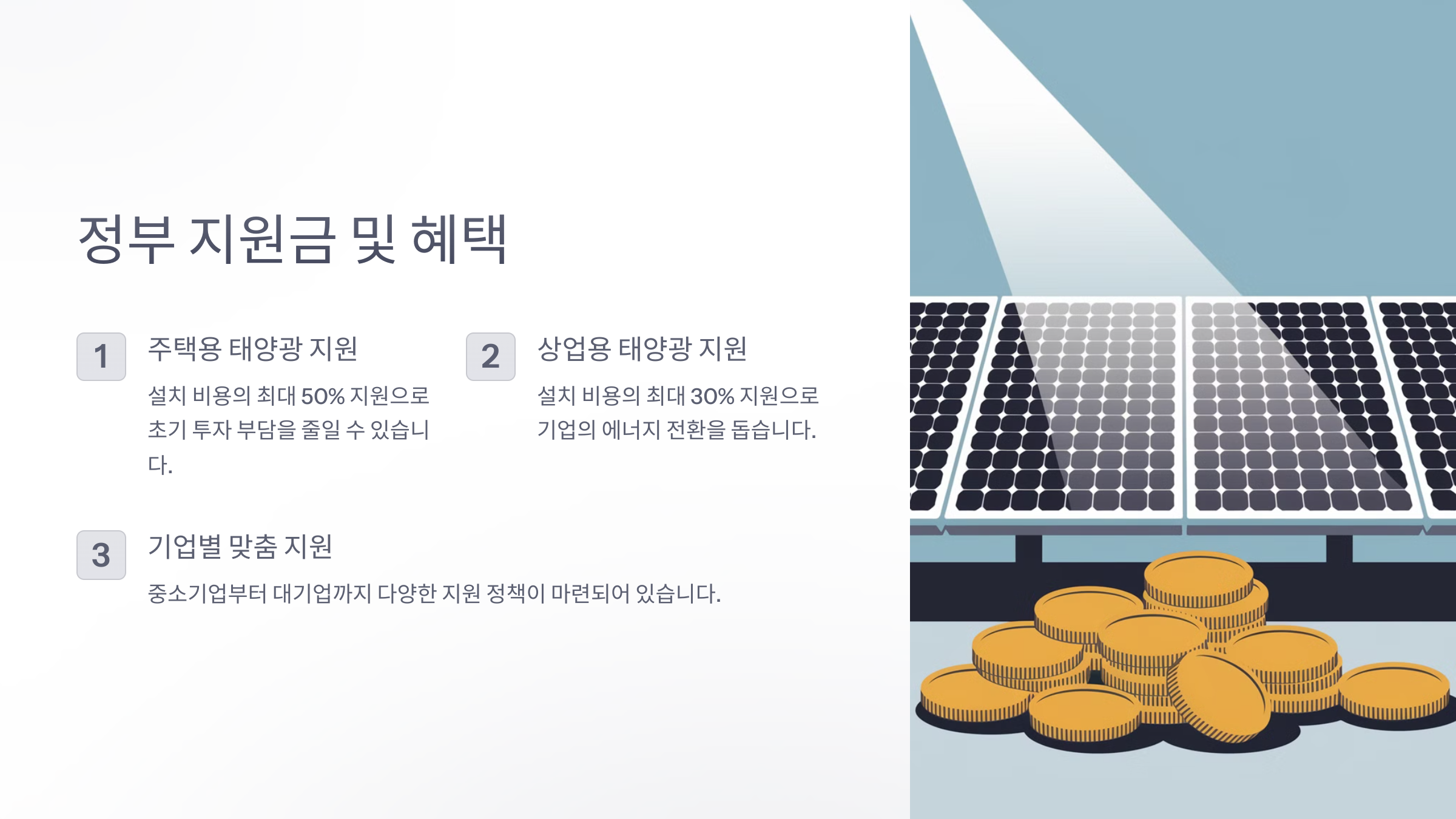 ✔ 한국에너지공단 태양광 보조금: 주택용 태양광(3kW 기준) 설치 시 최대 50%까지 보조금을 받을 수 있어요.