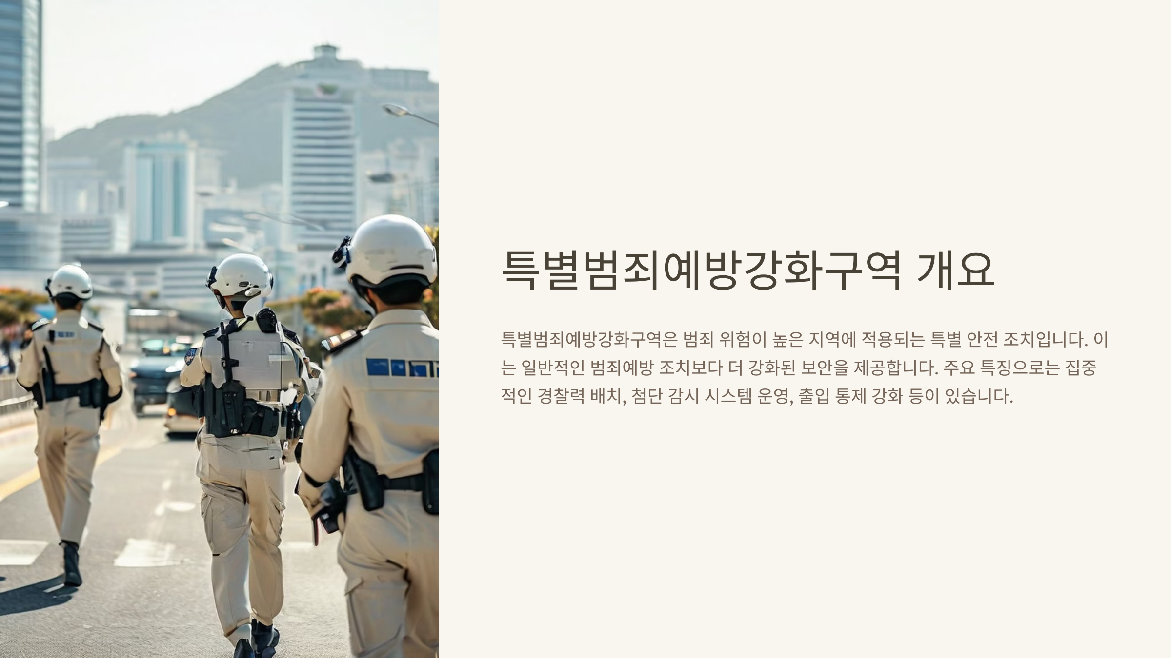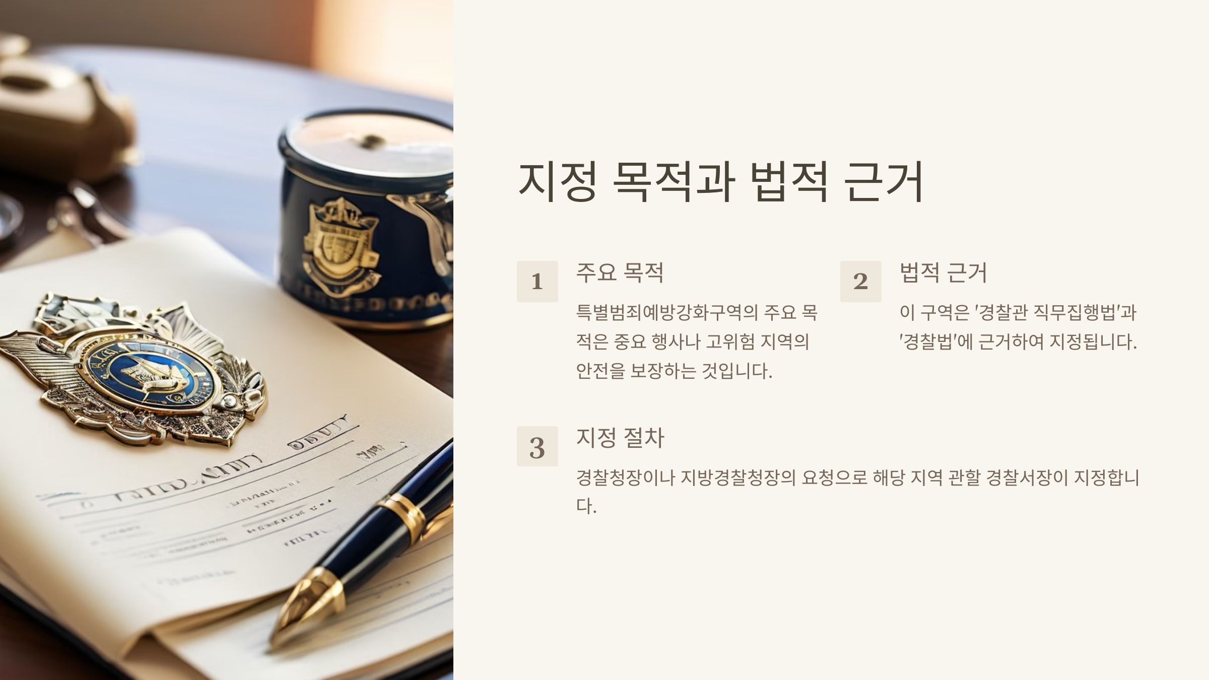 이제 다음 섹션에서 특별범죄예방강화구역의 법적 근거와 지정 목적을 살펴볼게요! 🚔