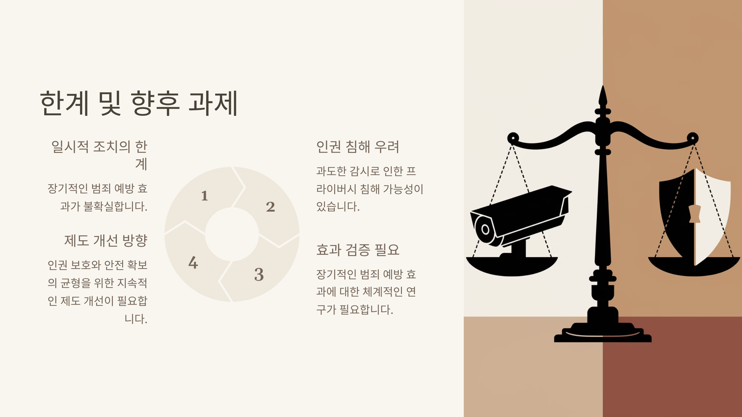 하지만 한계도 있어요. 과도한 감시로 인한 **사생활 침해 논란**이 발생할 수 있고, 특정 지역에만 집중되다 보니 **범죄가 다른 지역으로 이동하는 '풍선 효과'**가 나타날 수도 있어요.