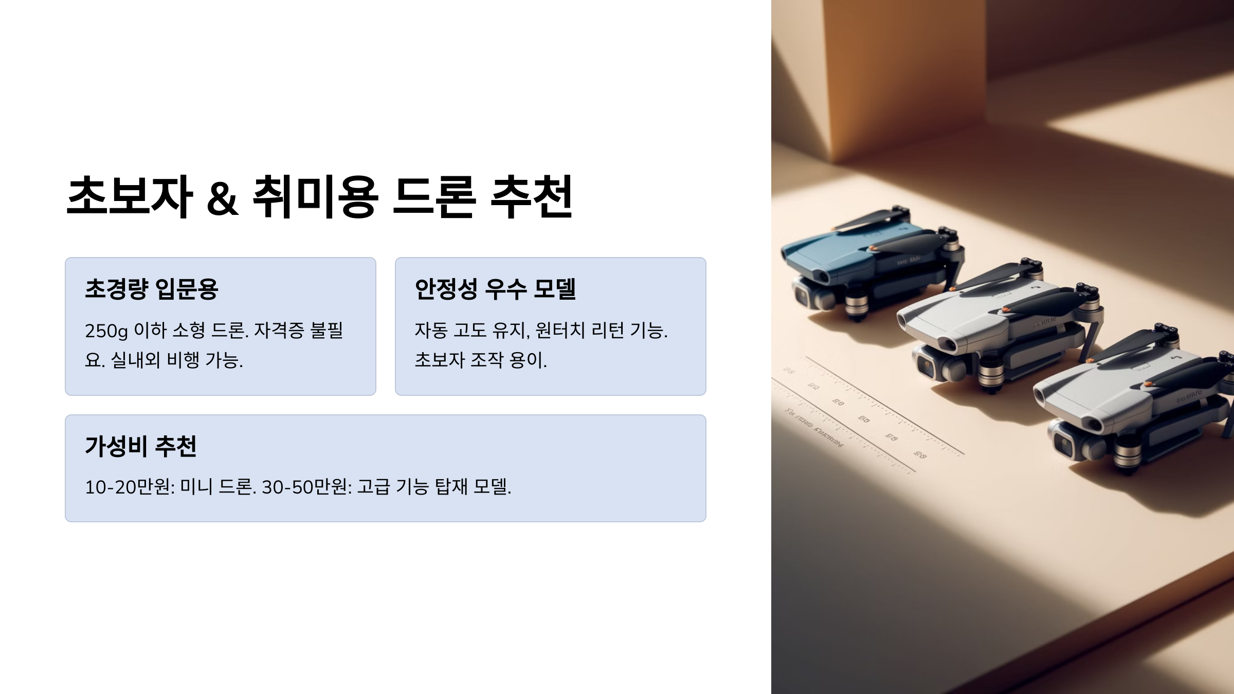초보자용 드론은 가격이 저렴하고 조종이 간편하며, 충돌 방지 기능이 탑재된 경우가 많아요. 250g 이하의 드론은 별도 자격증 없이 날릴 수 있어 **연습용으로 적합**해요!