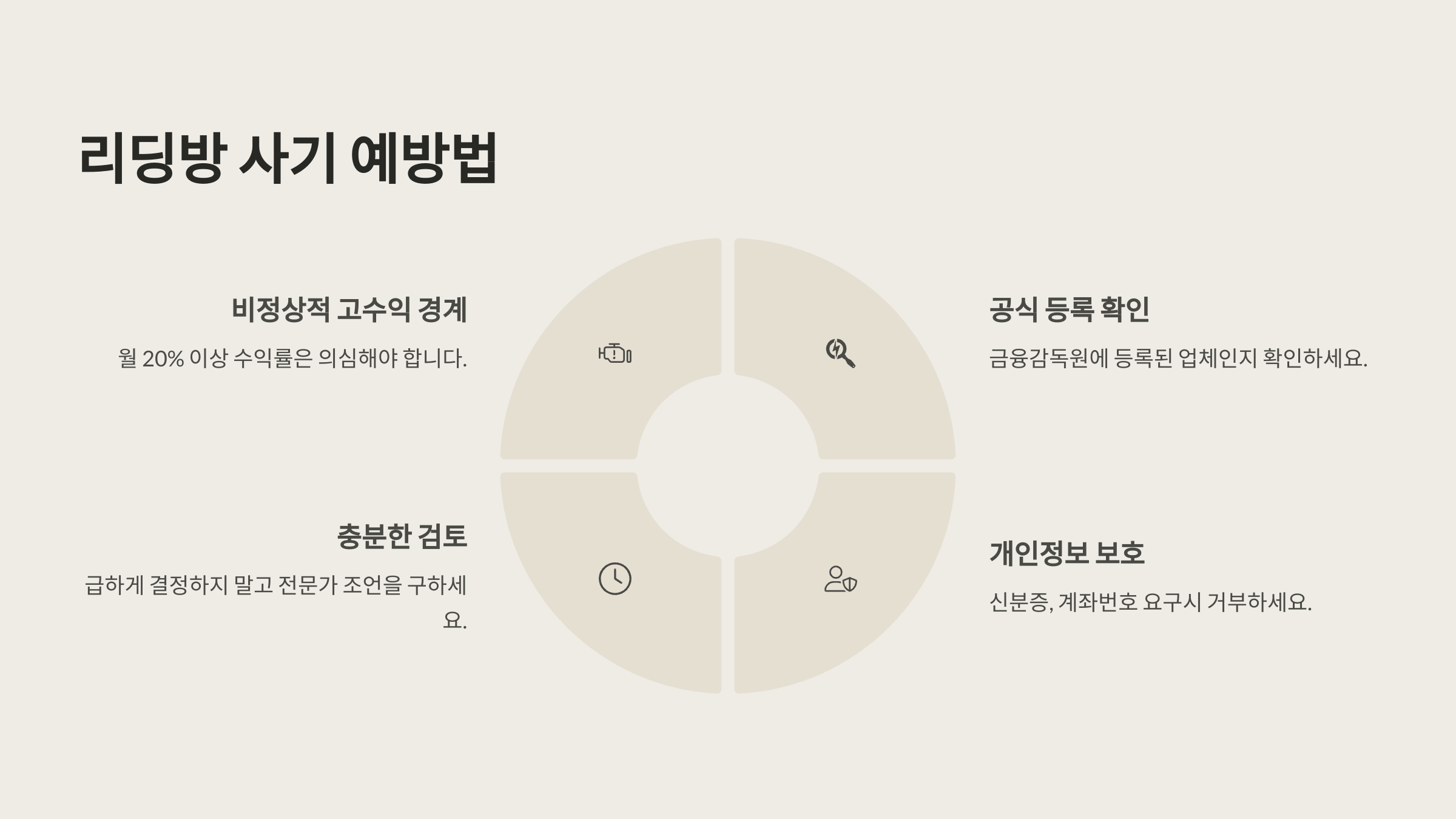 리딩방 사기에서 가장 중요한 것은 미리 알고 예방하는 거예요. 사기범들은 점점 더 교묘한 수법을 사용하고 있기 때문에 투자자 스스로 조심해야 해요.