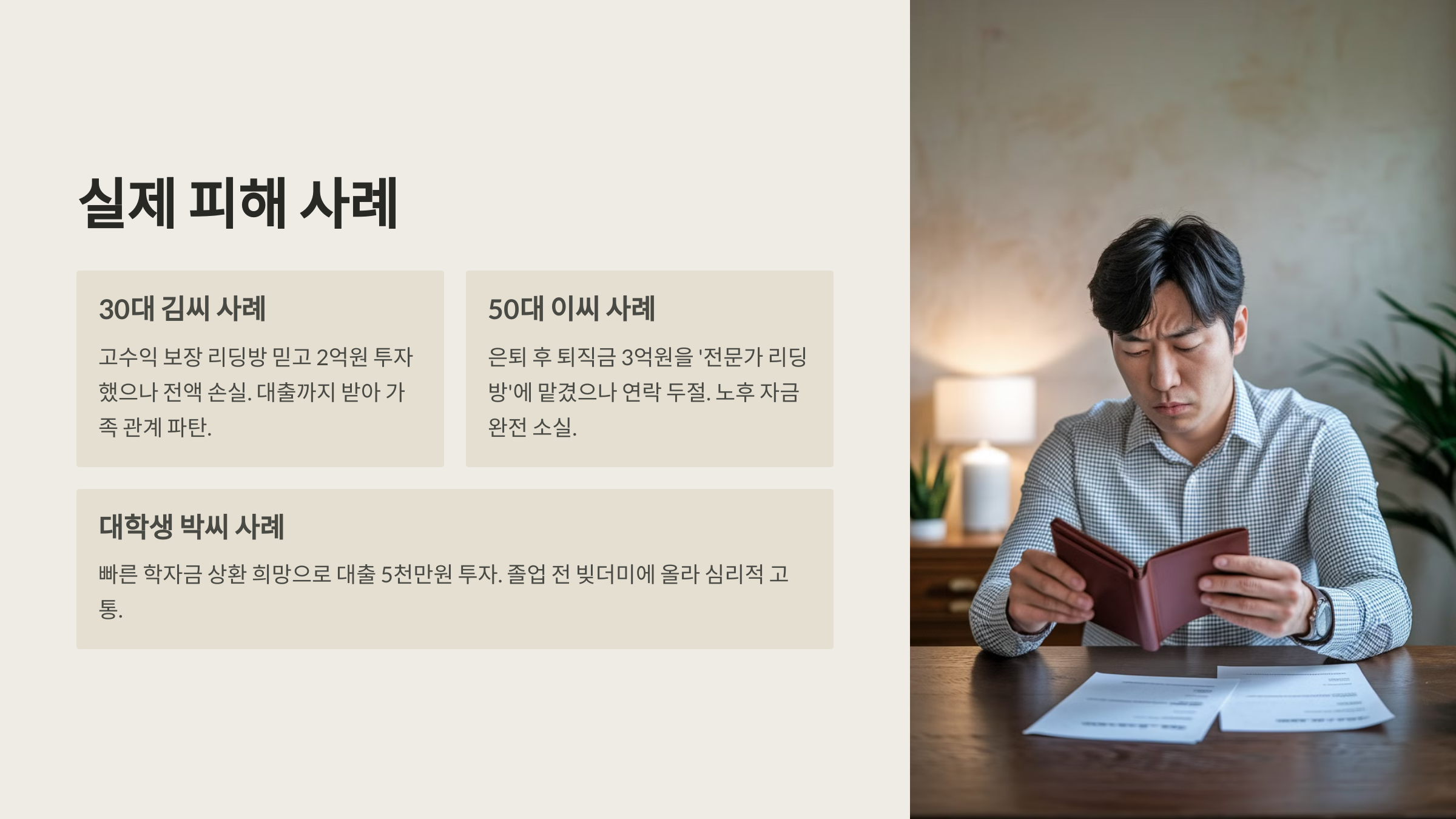 리딩방 사기는 단순한 가짜 정보 제공이 아니라, 실제로 많은 피해자를 양산하고 있어요. 피해자들은 처음에는 수익을 얻을 수 있을 것이라 믿었다가 결국 큰 손실을 보게 되죠.