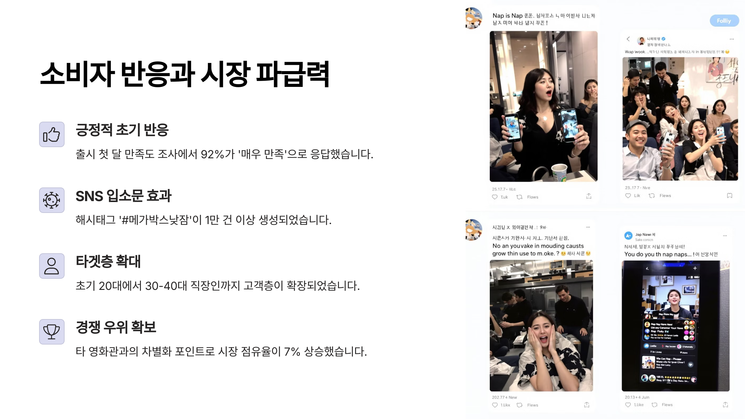 이와 동시에 SNS를 통한 바이럴 마케팅도 매우 효과적으로 진행됐어요. "이제 영화관에서 자도 돼?" 같은 유머성 콘텐츠로 MZ세대의 관심을 끌었고, 실제 이용 후기들이 커뮤니티와 인스타그램에 확산되며 자연스러운 입소문을 타게 됐죠.