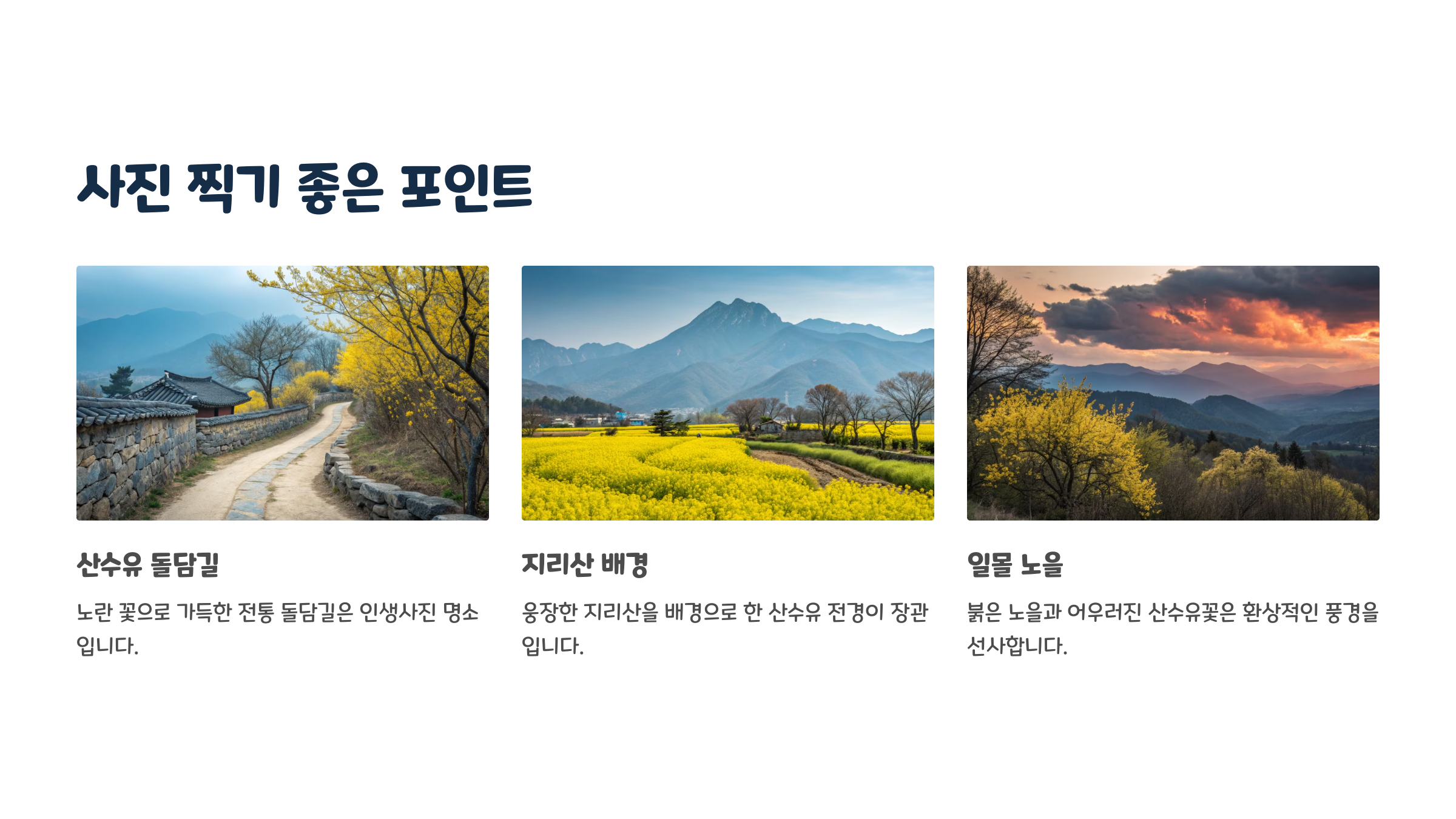 산수유 축제를 여행할 때는 꽃구경만 하지 말고, 주변 명소들도 함께 들러보면 더 알차게 즐길 수 있어요! 구례라면 ‘지리산 온천’, ‘화엄사’, ‘섬진강 자전거길’을 코스로 묶으면 힐링 여행이 완성돼요 🚴