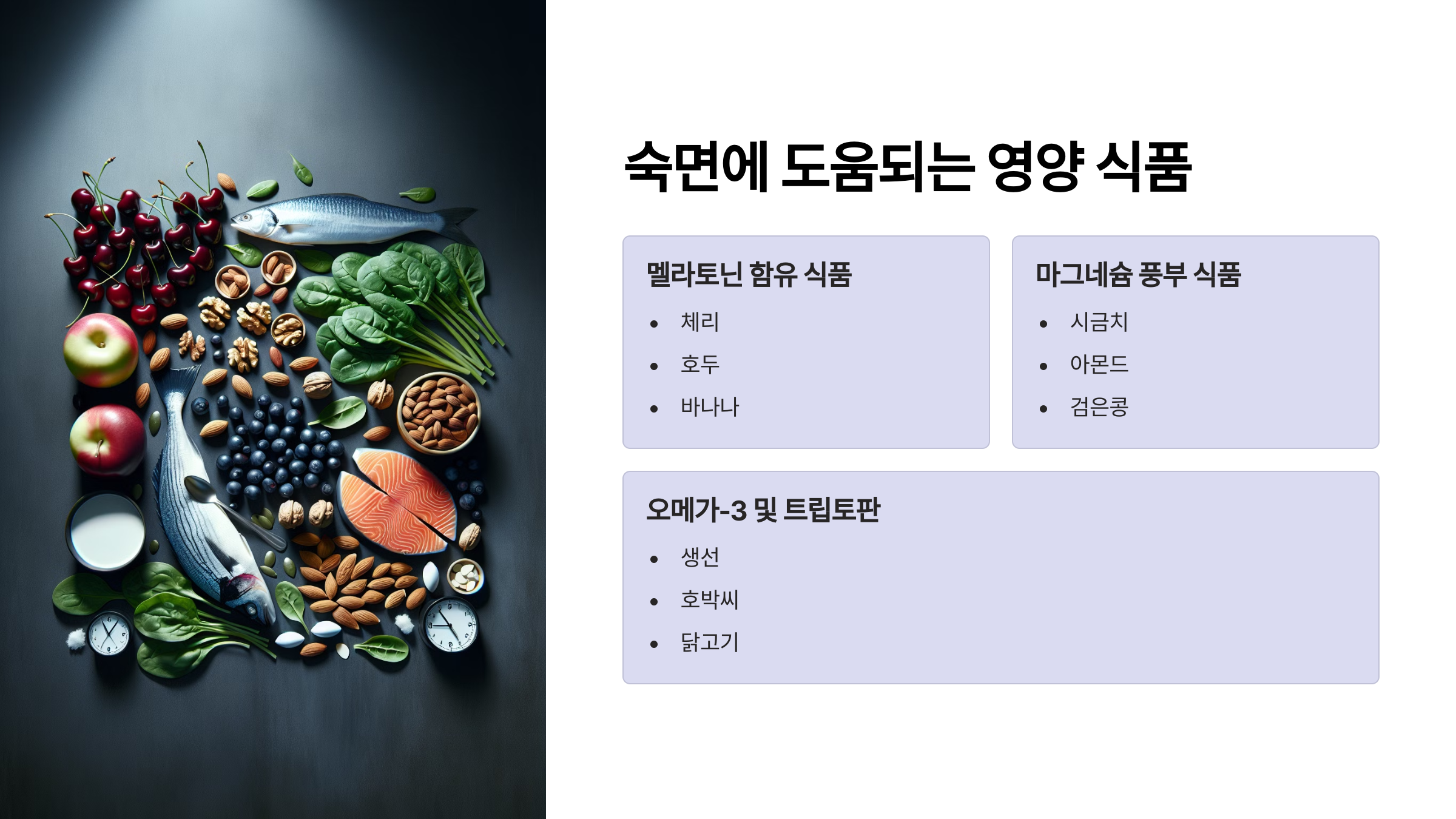 | 음식 | 수면에 미치는 영향 | 섭취 타이밍 |