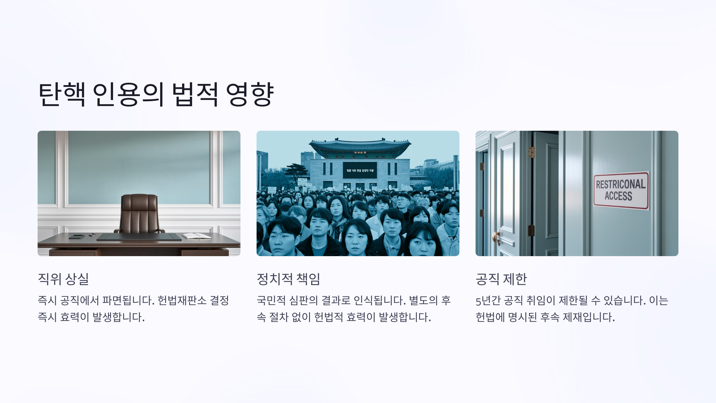 인용이 결정되면 해당 공직자는 즉시 파면되고, 다시는 같은 직책에 복귀할 수 없어요. 공직에서 완전히 물러나게 되는 거죠. 정치적, 사회적으로도 큰 파장을 일으키는 결정이에요.