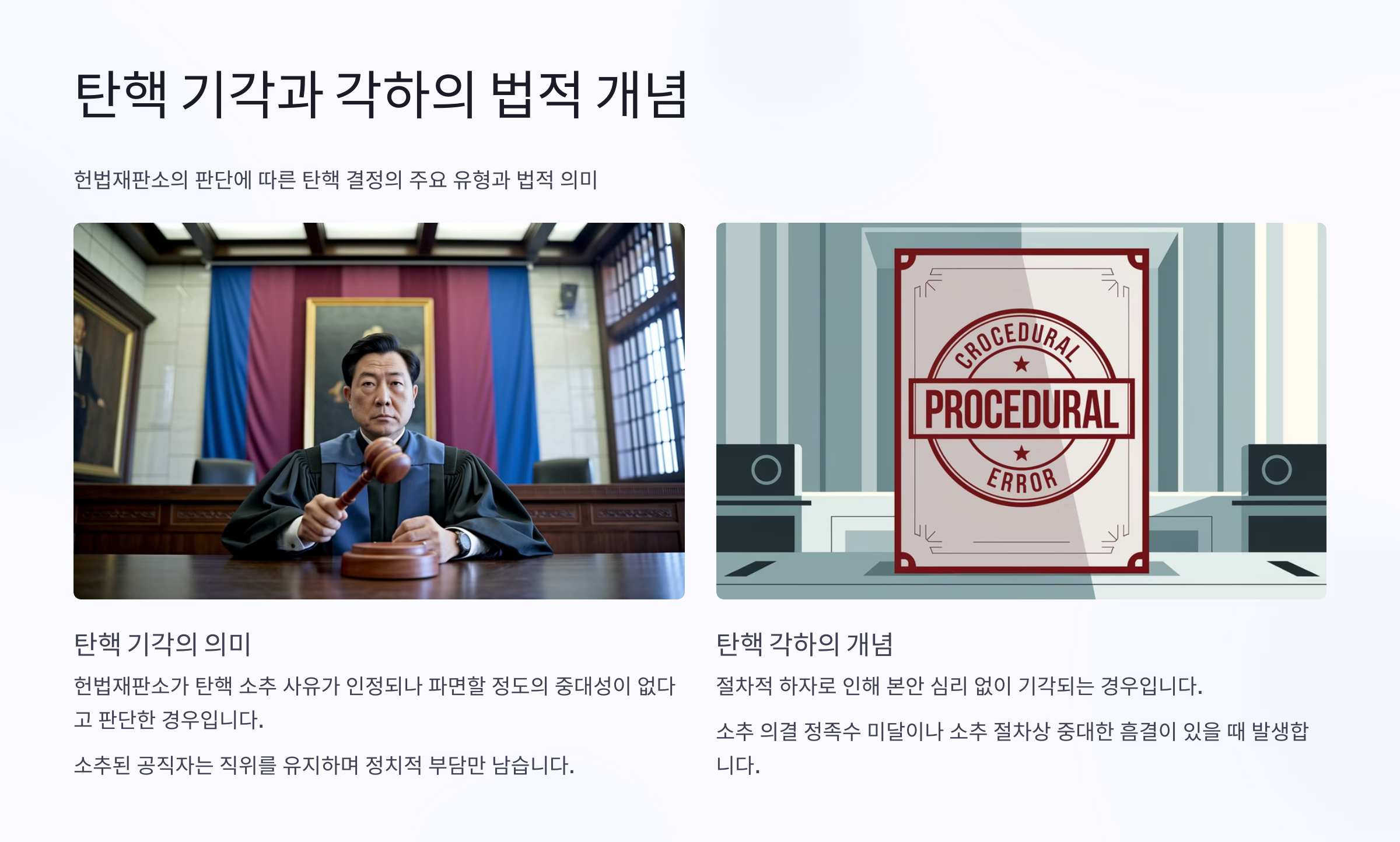 각하는 헌법재판소가 "이건 탄핵심판의 요건이 안 돼요"라고 판단하는 것이기 때문에, 심리 자체가 시작되지 않고 종결된다는 점이 가장 큰 특징이에요.