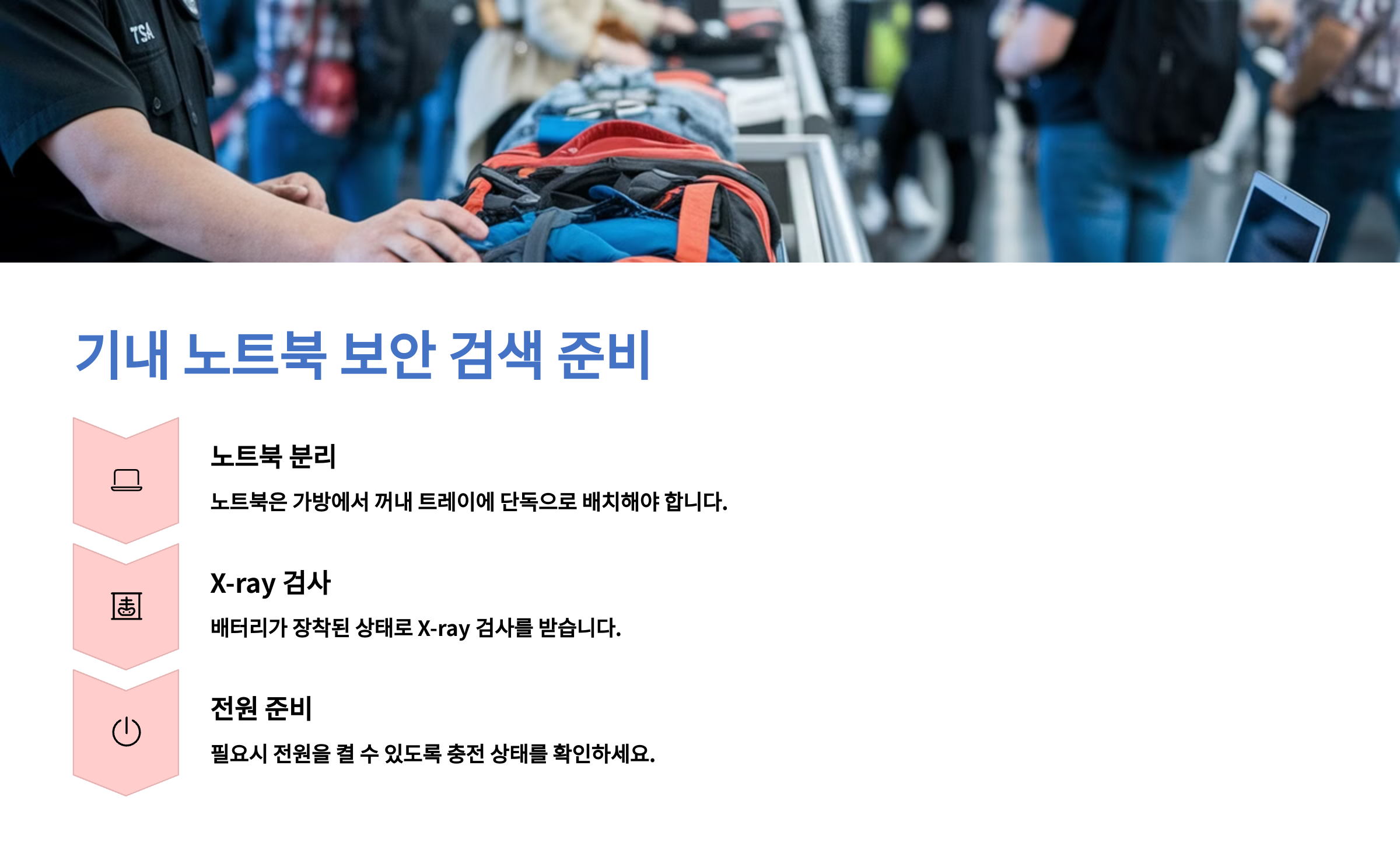 | 노트북 꺼내기 | 보안대에서 별도 트레이 사용 | 가방 깊숙이 넣지 않기 |