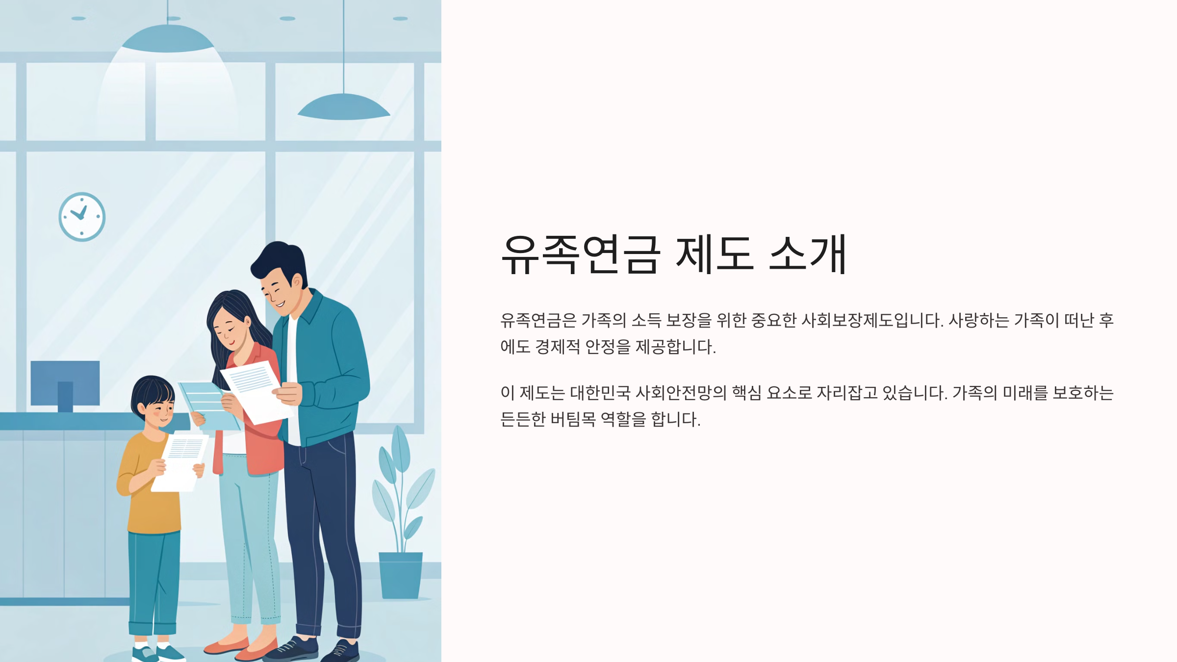 유족연금은 단순히 보험금처럼 일시금이 아니라, 지속적인 연금 형태로 지급된다는 점에서 큰 의미가 있어요. 특히 생계를 함께하던 배우자가 사망한 경우, 남은 가족의 생활을 유지하는 데 실질적인 도움을 주는 제도랍니다.