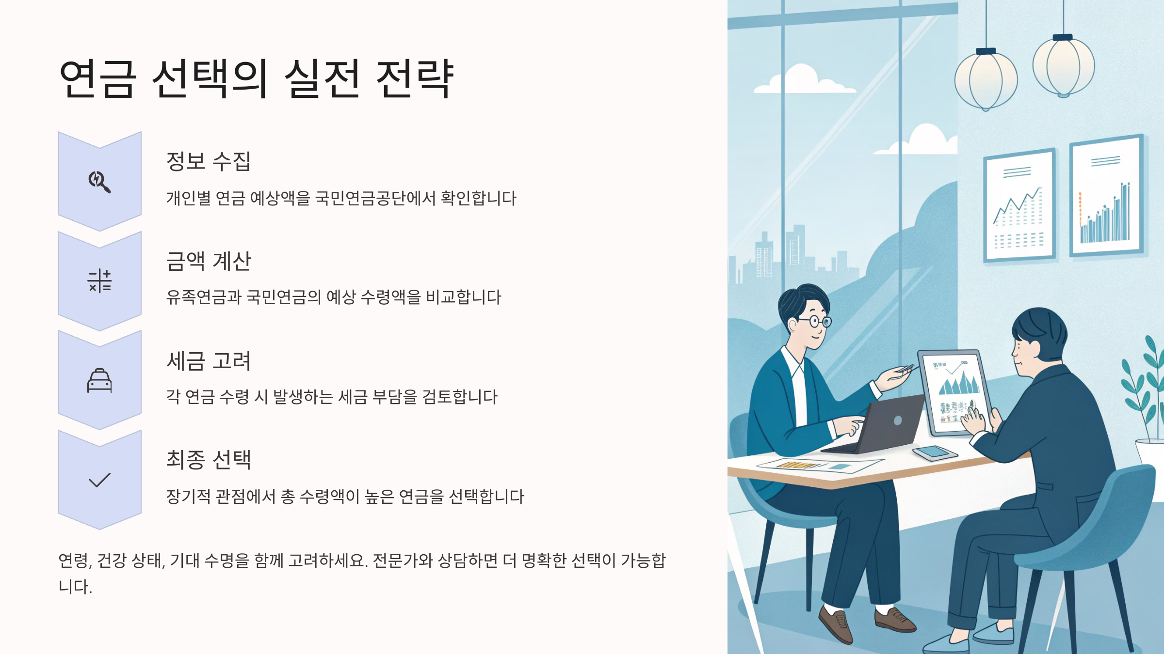 유족연금과 국민연금, 둘 다 받을 수 있다면 어떻게 선택해야 할까요? 핵심은 총 수령액이 더 많은 조합을 선택하는 거예요. 무작정 유족연금만 받거나, 국민연금만 선택하면 손해 볼 수도 있어요.💰