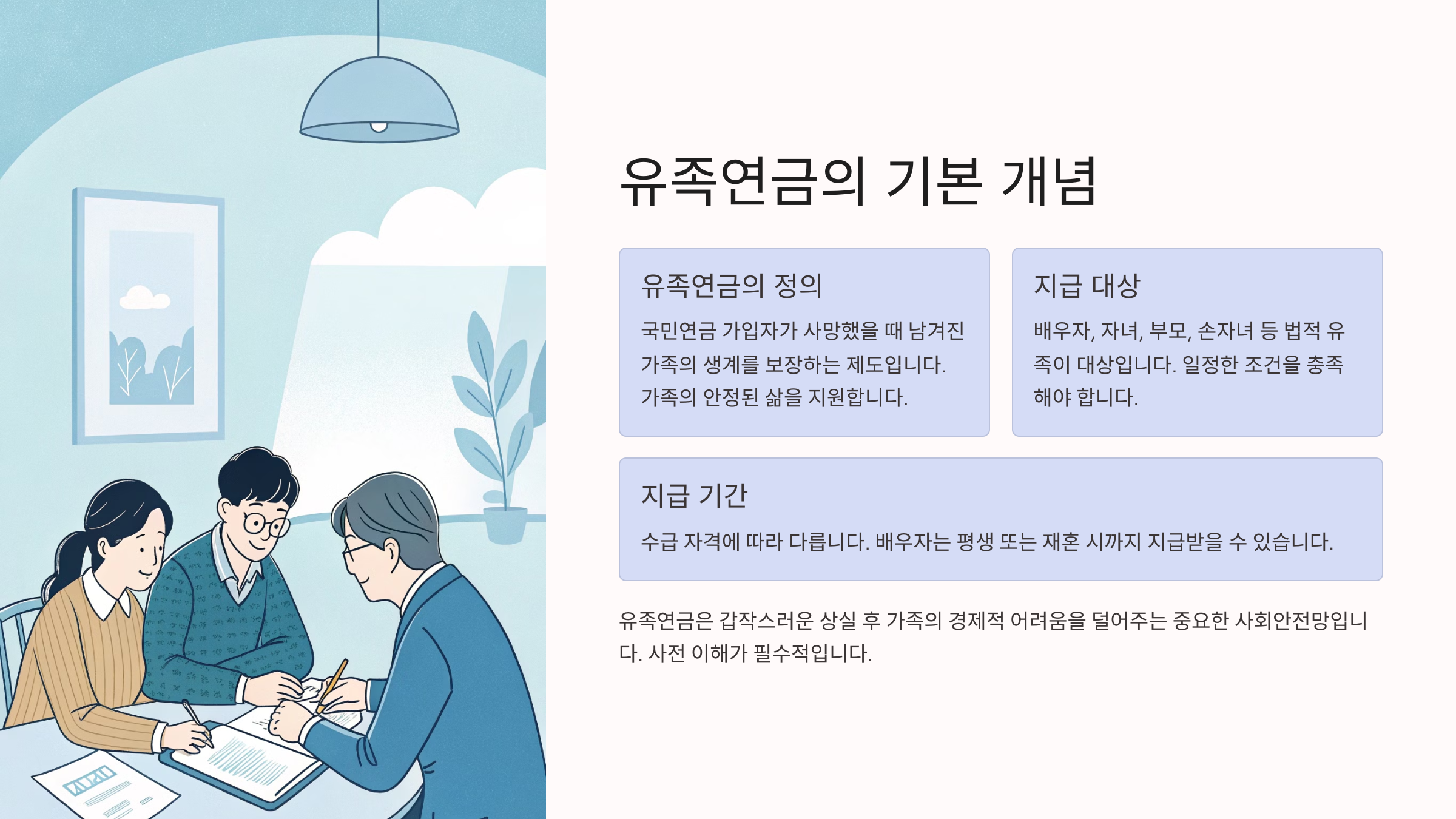 유족연금은 국민연금 가입자 또는 연금 수급자가 사망했을 때, 그 가족에게 지급되는 사망 보장 성격의 연금이에요. 쉽게 말해, 연금 납부자가 세상을 떠났을 때 그분의 배우자나 자녀, 부모가 받게 되는 일종의 '연금 상속' 개념이죠.🕊️