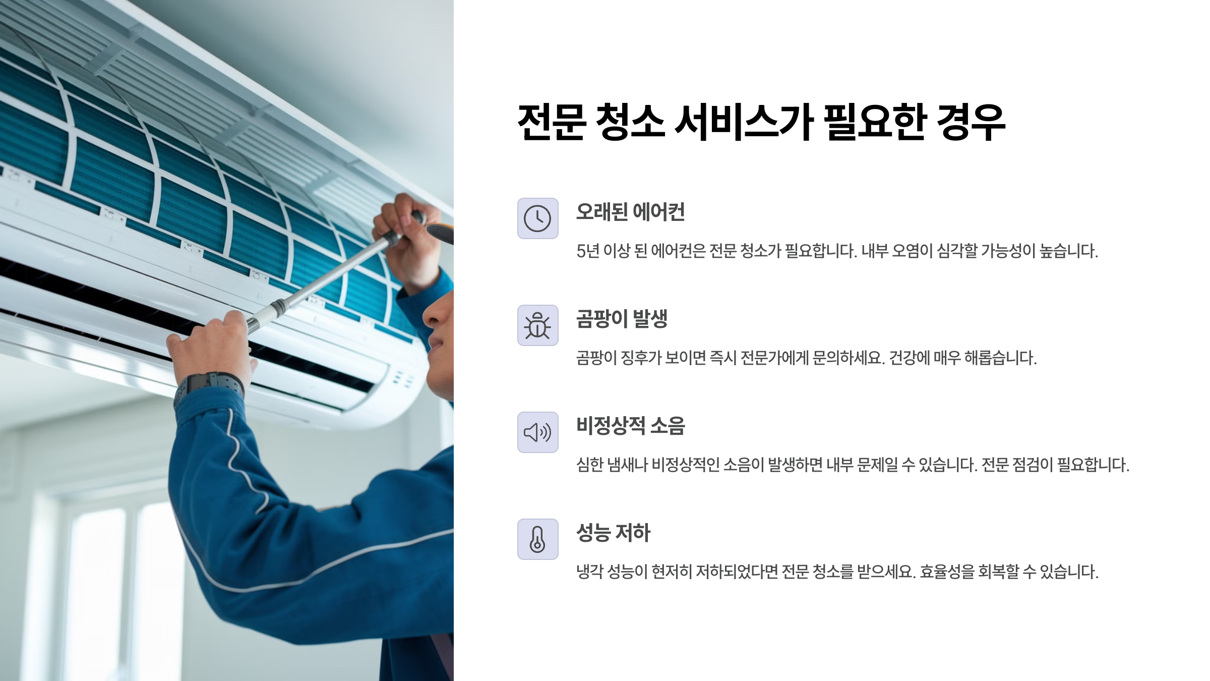 에어컨을 2년 이상 청소하지 않았거나, 사용 시 곰팡이 냄새가 심하게 날 경우, 혹은 에어컨을 틀면 기침이나 재채기가 심해지는 경우엔 전문 청소를 받는 게 좋아요. 건강 문제와 직결되는 부분이니까요.