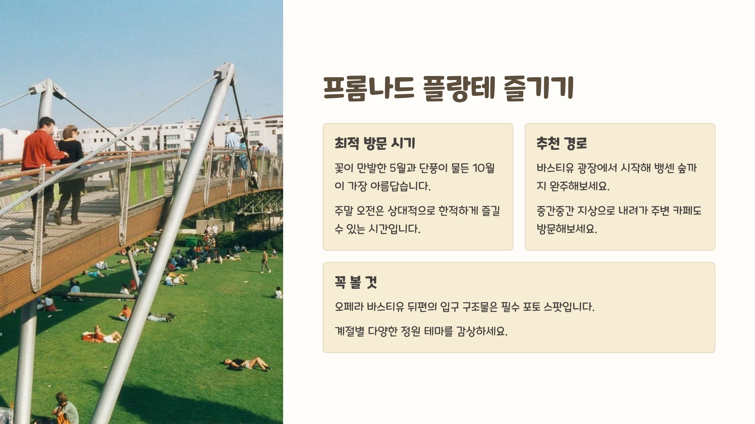 프롬나드 플랑테는 관광객에게도, 현지인에게도 여유로운 도심 속 피난처 같은 공간이에요. 제대로 즐기려면 몇 가지 꿀팁을 알고 가면 훨씬 풍성한 경험을 할 수 있답니다. 지금부터 현장에서 활용 가능한 팁들을 소개해볼게요! ☀️