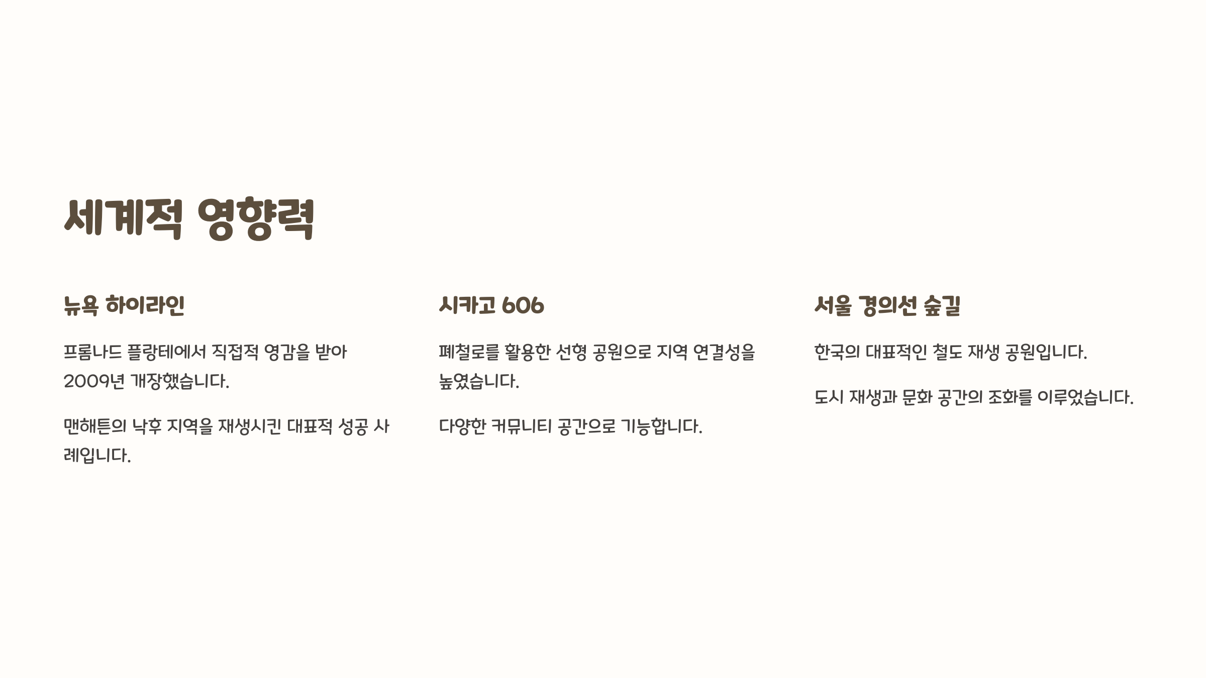 | 2000년대 이후 | 뉴욕 하이라인 등 유사 모델 등장 |