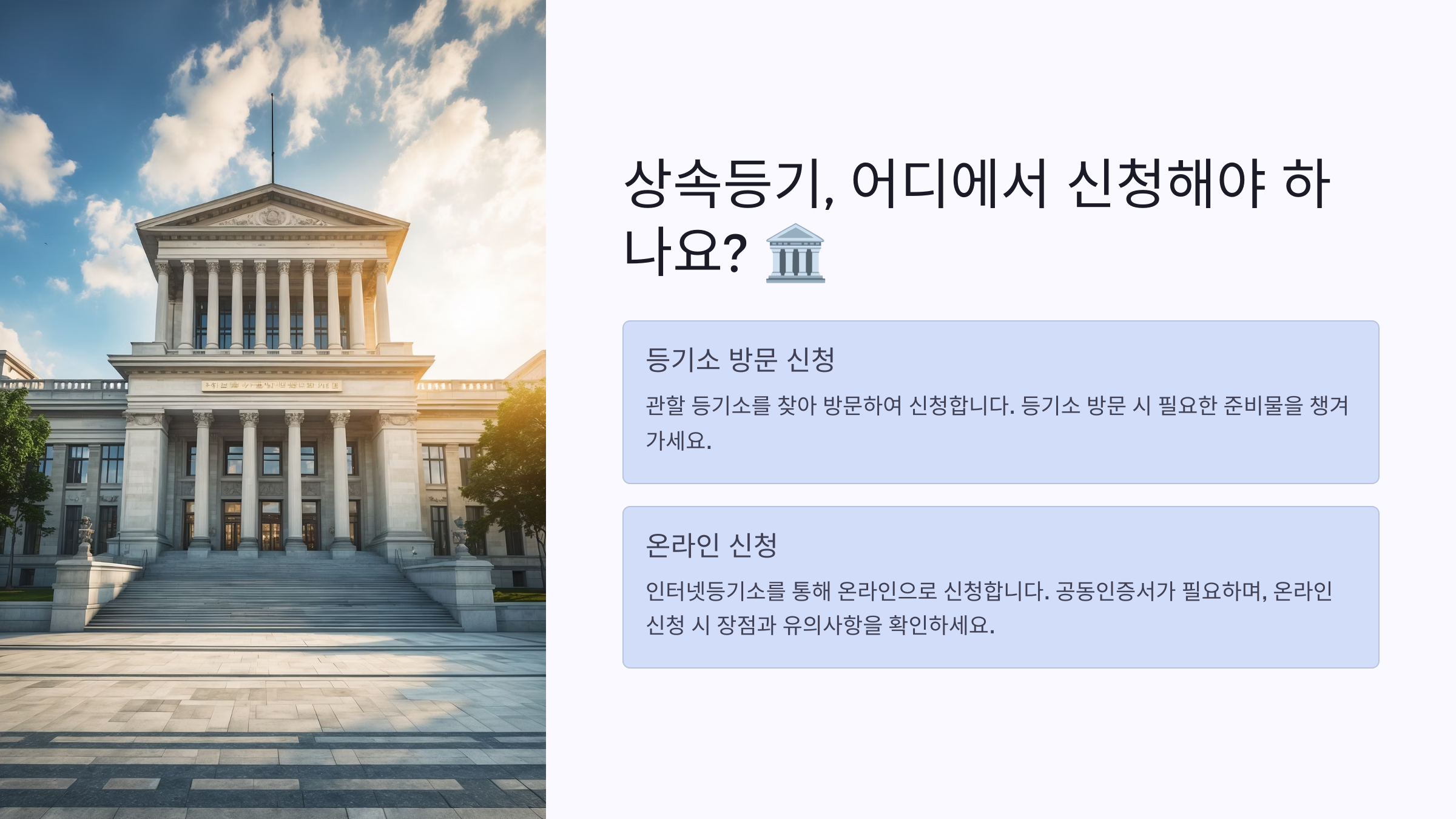 상속등기는 부동산의 소재지에 따라 관할 등기소에서 신청해야 해요. 주소지 기준이 아니라, 부동산이 어디에 있는지가 가장 중요하다는 점 꼭 기억하세요! 요즘은 온라인 접수도 가능해서, 거리가 멀어도 편리하게 처리할 수 있어요.
