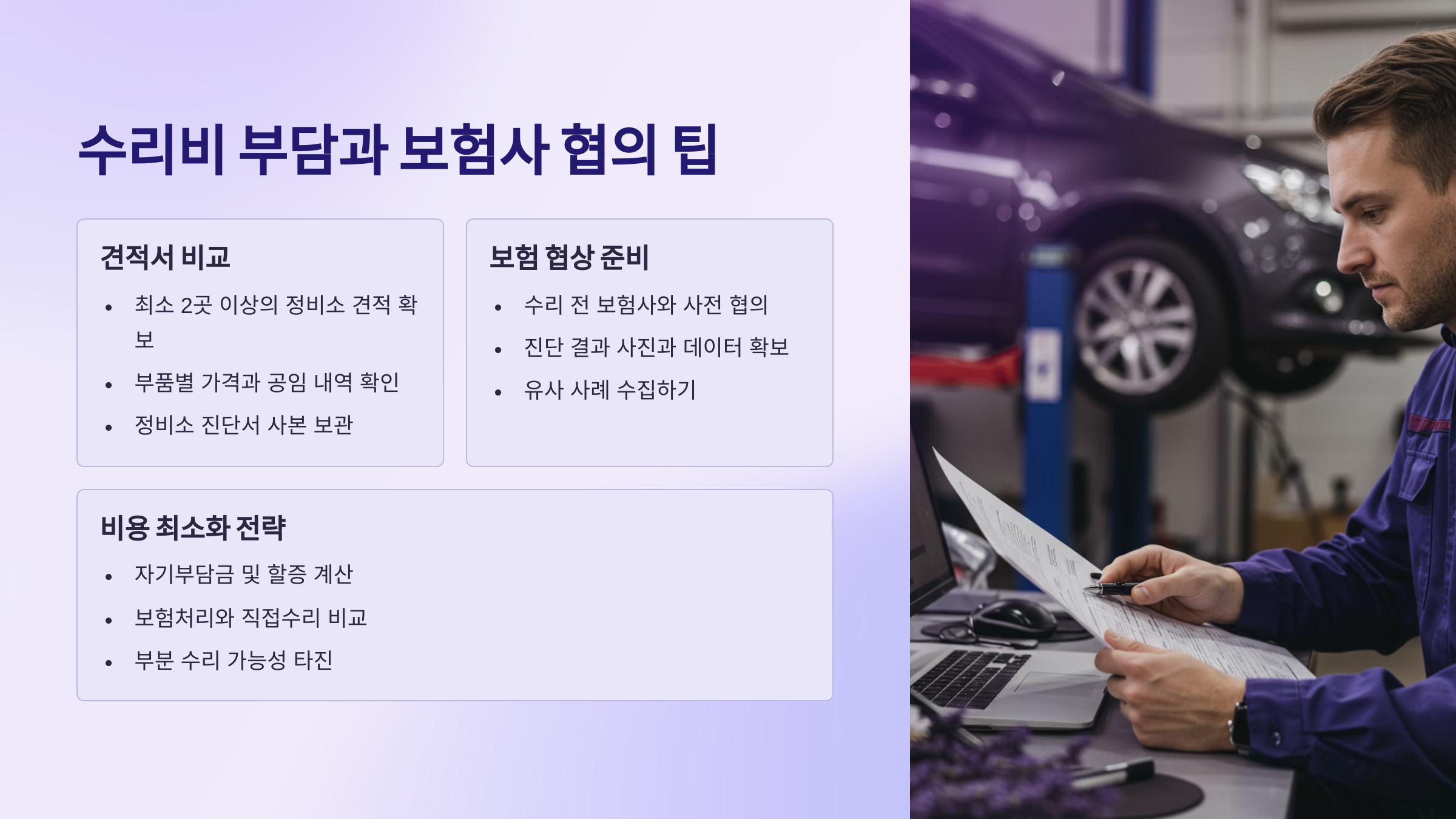 수리비가 크거나 보험 적용이 애매한 경우에는, 보험사와 협의하는 동안 '임시 견적서'를 정비소에서 받아 두는 것도 좋아요. 이렇게 준비를 잘하면 예상치 못한 비용 부담을 줄일 수 있고, 보상도 빨라진답니다. 😉