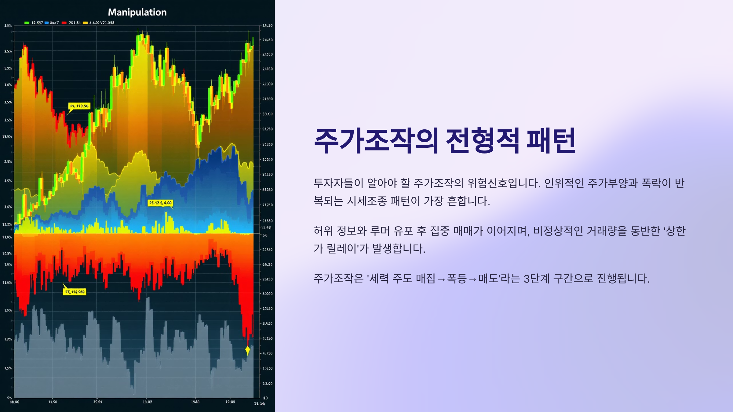 투자자들이 몰리면, 주가는 급등하고 거래량도 폭발해요. 일반 투자자들은 “이건 뭔가 있다”는 생각에 뒤늦게 매수에 뛰어들게 되죠. 하지만 그 순간이 바로 작전세력이 매도하는 타이밍이에요. ‘펌프 앤 덤프(Pump & Dump)’라는 전형적인 수법이에요.
