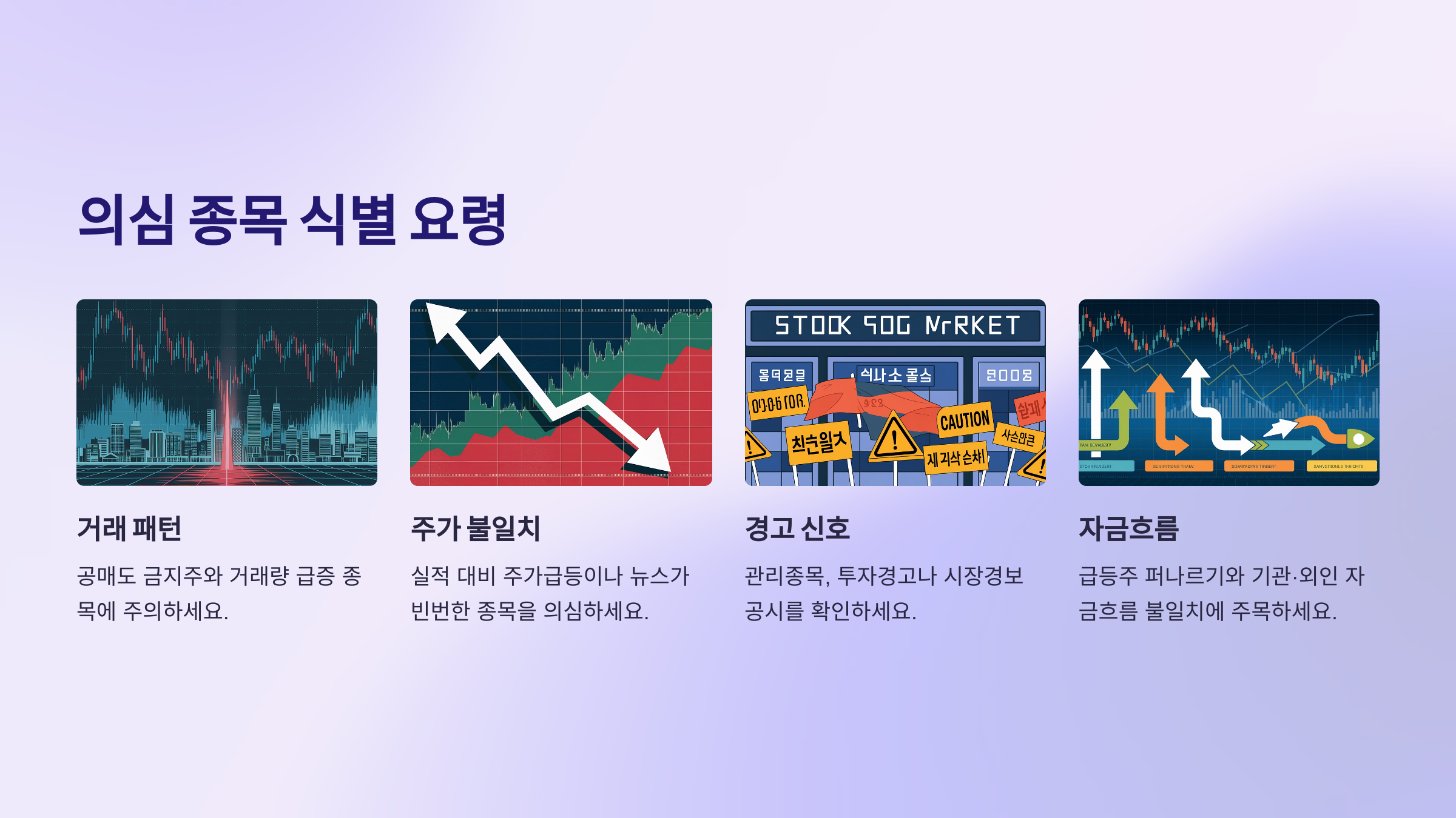 A2. 거래량 급증, 연속 상승, 공시와 무관한 주가 상승, SNS에서 과도한 추천이 동시에 나타나는 종목은 의심해볼 필요가 있어요.