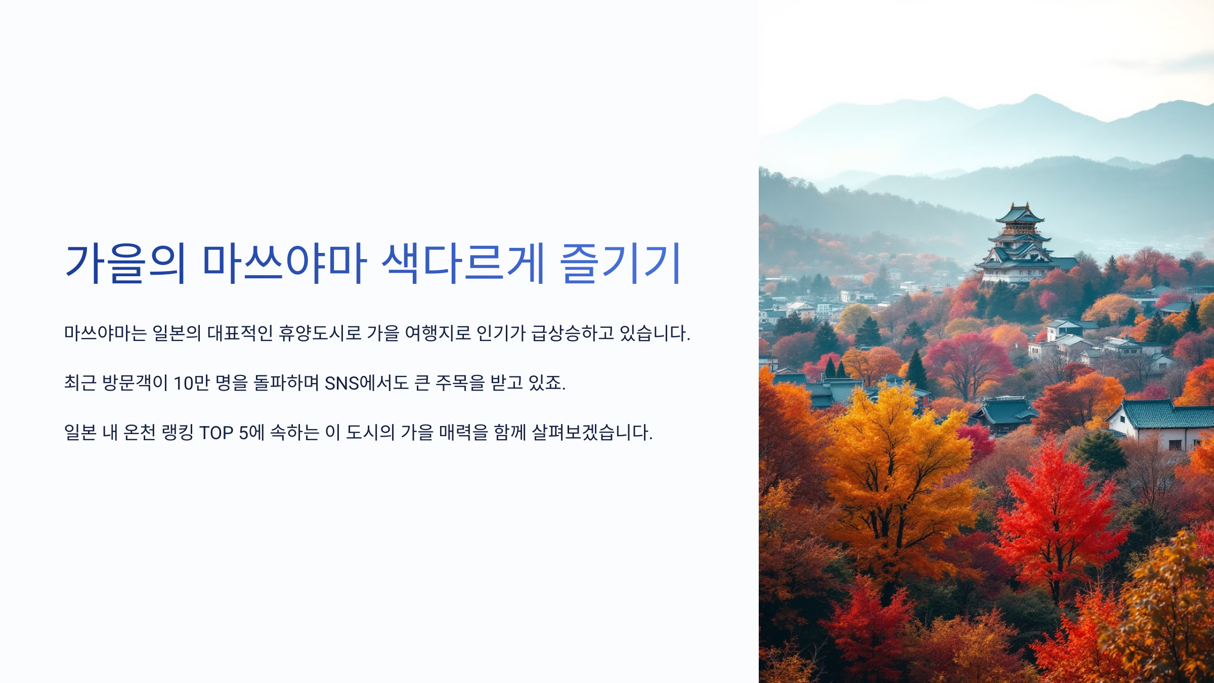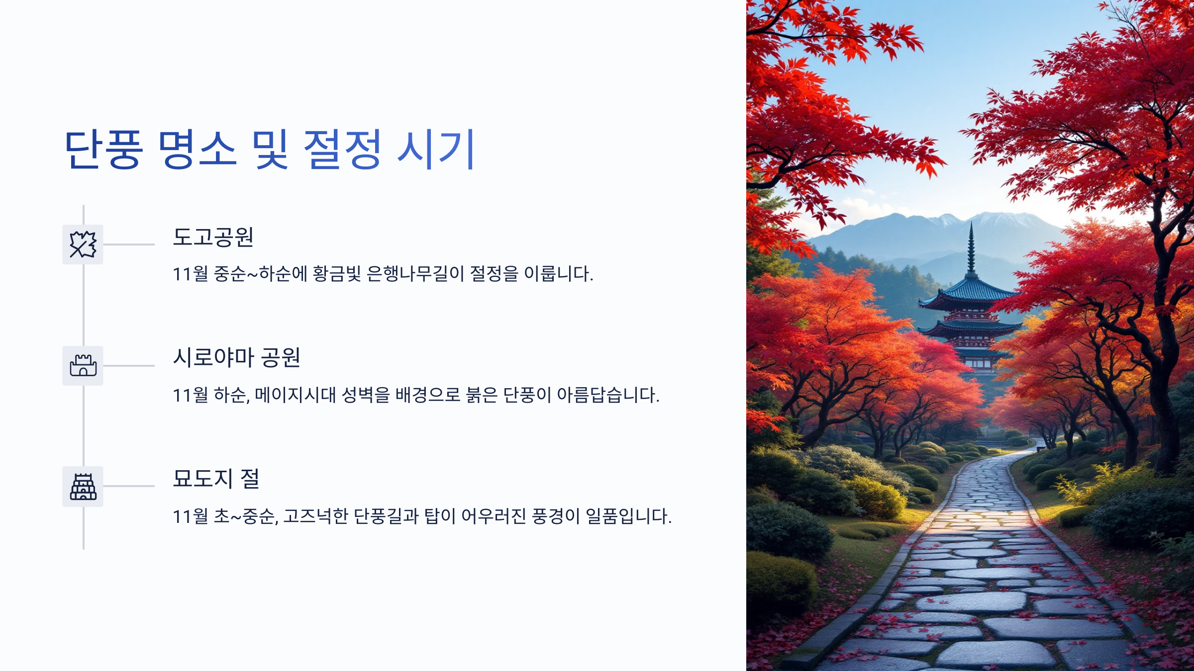 이렇게 마쓰야마의 가을은 시기별, 장소별로 다양한 단풍 풍경을 즐길 수 있어요. 저마다 다른 분위기와 색감을 보여주니 일정에 맞춰 적절한 곳을 선택해서 방문하면 정말 멋진 가을 여행이 될 거예요! 🍂